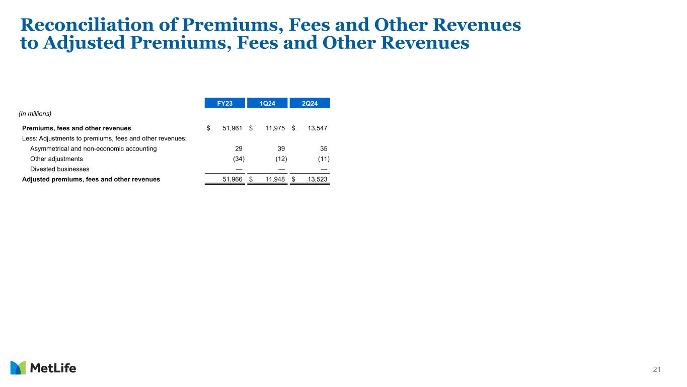| (3) Includes MetLife, Inc.'s share of adjusted premiums, fees and other revenues for operating joint ventures in: (i) China, (ii) India, (iii) Malaysia and (iv) Vietnam, on the basis of proportional consolidation and MetLife's percentage ownership. These operating joint ventures are accounted for using the equity method of accounting under GAAP. | |||||||||||||||||||||||||||||||||||||||||||||||||||||