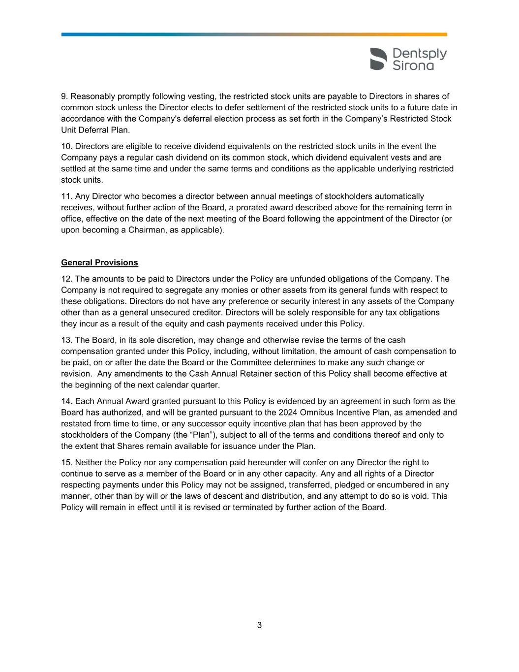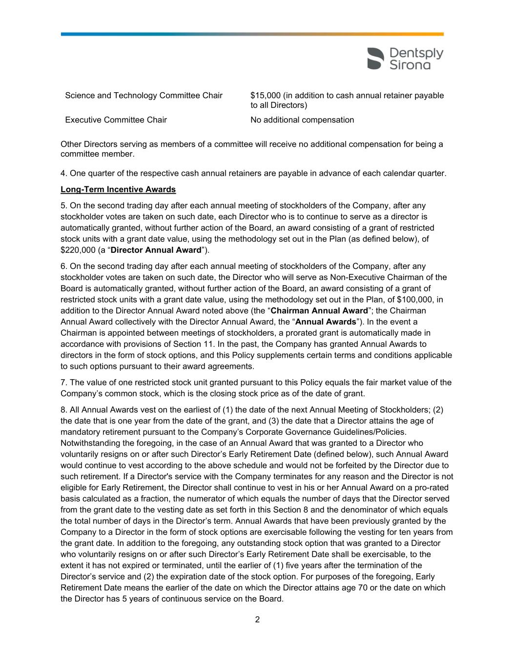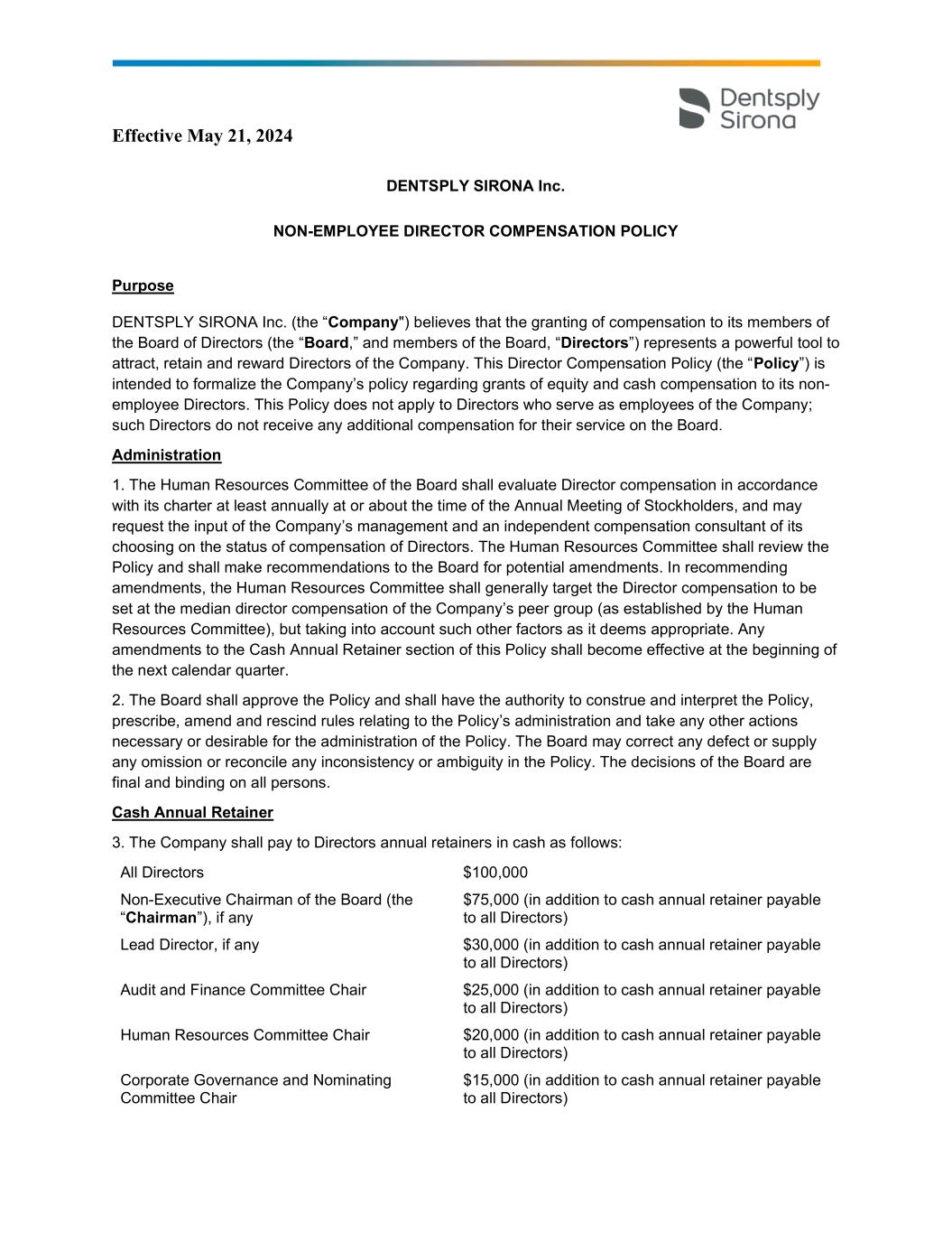 Effective May 21, 2024 DENTSPLY SIRONA Inc. NON-EMPLOYEE DIRECTOR COMPENSATION POLICY Purpose DENTSPLY SIRONA Inc. (the “Company") believes that the granting of compensation to its members of the Board of Directors (the “Board,” and members of the Board, “Directors”) represents a powerful tool to attract, retain and reward Directors of the Company. This Director Compensation Policy (the “Policy”) is intended to formalize the Company’s policy regarding grants of equity and cash compensation to its non- employee Directors. This Policy does not apply to Directors who serve as employees of the Company; such Directors do not receive any additional compensation for their service on the Board. Administration 1. The Human Resources Committee of the Board shall evaluate Director compensation in accordance with its charter at least annually at or about the time of the Annual Meeting of Stockholders, and may request the input of the Company’s management and an independent compensation consultant of its choosing on the status of compensation of Directors. The Human Resources Committee shall review the Policy and shall make recommendations to the Board for potential amendments. In recommending amendments, the Human Resources Committee shall generally target the Director compensation to be set at the median director compensation of the Company’s peer group (as established by the Human Resources Committee), but taking into account such other factors as it deems appropriate. Any amendments to the Cash Annual Retainer section of this Policy shall become effective at the beginning of the next calendar quarter. 2. The Board shall approve the Policy and shall have the authority to construe and interpret the Policy, prescribe, amend and rescind rules relating to the Policy’s administration and take any other actions necessary or desirable for the administration of the Policy. The Board may correct any defect or supply any omission or reconcile any inconsistency or ambiguity in the Policy. The decisions of the Board are final and binding on all persons. Cash Annual Retainer 3. The Company shall pay to Directors annual retainers in cash as follows: All Directors $100,000 Non-Executive Chairman of the Board (the “Chairman”), if any $75,000 (in addition to cash annual retainer payable to all Directors) Lead Director, if any $30,000 (in addition to cash annual retainer payable to all Directors) Audit and Finance Committee Chair $25,000 (in addition to cash annual retainer payable to all Directors) Human Resources Committee Chair $20,000 (in addition to cash annual retainer payable to all Directors) Corporate Governance and Nominating Committee Chair $15,000 (in addition to cash annual retainer payable to all Directors)