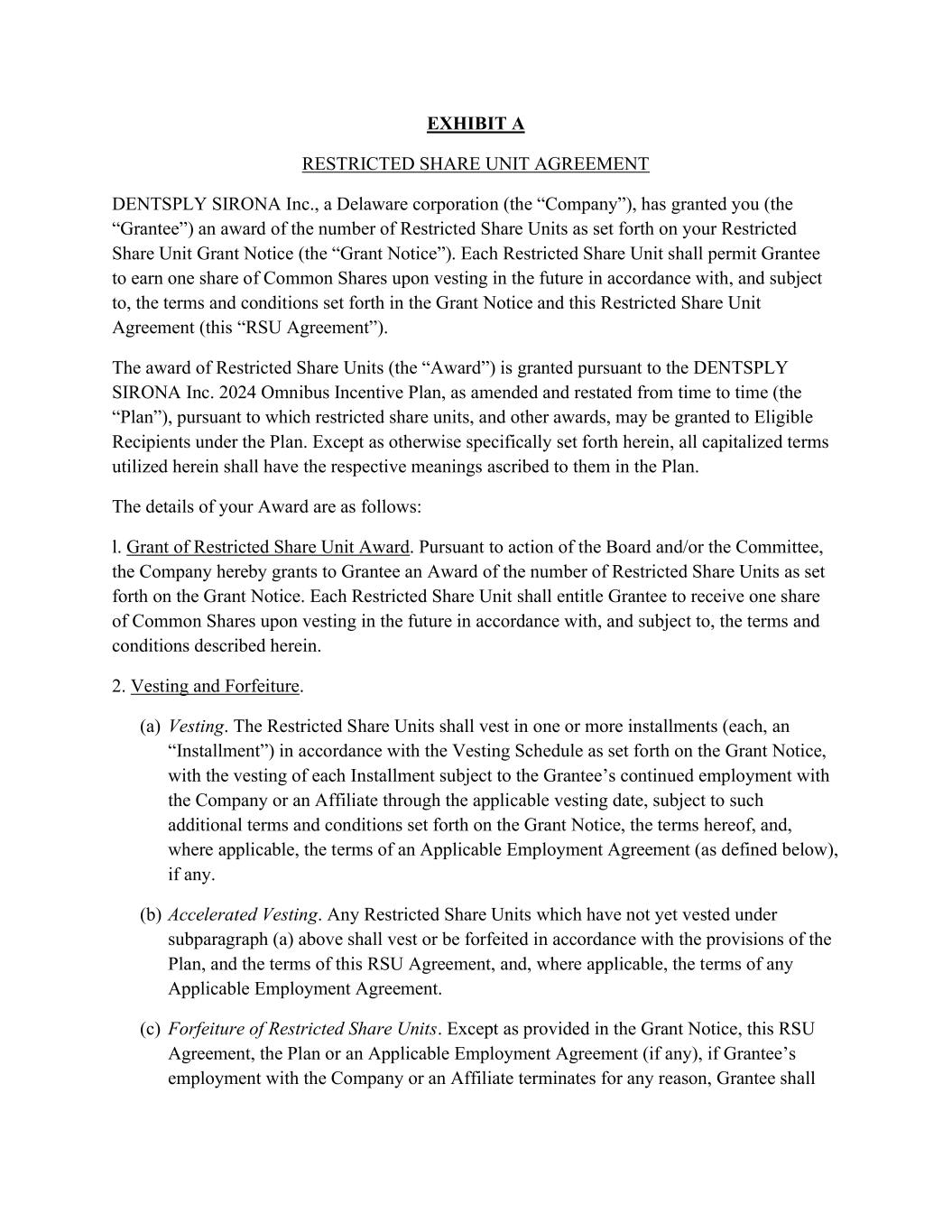 EXHIBIT A RESTRICTED SHARE UNIT AGREEMENT DENTSPLY SIRONA Inc., a Delaware corporation (the “Company”), has granted you (the “Grantee”) an award of the number of Restricted Share Units as set forth on your Restricted Share Unit Grant Notice (the “Grant Notice”). Each Restricted Share Unit shall permit Grantee to earn one share of Common Shares upon vesting in the future in accordance with, and subject to, the terms and conditions set forth in the Grant Notice and this Restricted Share Unit Agreement (this “RSU Agreement”). The award of Restricted Share Units (the “Award”) is granted pursuant to the DENTSPLY SIRONA Inc. 2024 Omnibus Incentive Plan, as amended and restated from time to time (the “Plan”), pursuant to which restricted share units, and other awards, may be granted to Eligible Recipients under the Plan. Except as otherwise specifically set forth herein, all capitalized terms utilized herein shall have the respective meanings ascribed to them in the Plan. The details of your Award are as follows: l. Grant of Restricted Share Unit Award. Pursuant to action of the Board and/or the Committee, the Company hereby grants to Grantee an Award of the number of Restricted Share Units as set forth on the Grant Notice. Each Restricted Share Unit shall entitle Grantee to receive one share of Common Shares upon vesting in the future in accordance with, and subject to, the terms and conditions described herein. 2. Vesting and Forfeiture. (a) Vesting. The Restricted Share Units shall vest in one or more installments (each, an “Installment”) in accordance with the Vesting Schedule as set forth on the Grant Notice, with the vesting of each Installment subject to the Grantee’s continued employment with the Company or an Affiliate through the applicable vesting date, subject to such additional terms and conditions set forth on the Grant Notice, the terms hereof, and, where applicable, the terms of an Applicable Employment Agreement (as defined below), if any. (b) Accelerated Vesting. Any Restricted Share Units which have not yet vested under subparagraph (a) above shall vest or be forfeited in accordance with the provisions of the Plan, and the terms of this RSU Agreement, and, where applicable, the terms of any Applicable Employment Agreement. (c) Forfeiture of Restricted Share Units. Except as provided in the Grant Notice, this RSU Agreement, the Plan or an Applicable Employment Agreement (if any), if Grantee’s employment with the Company or an Affiliate terminates for any reason, Grantee shall