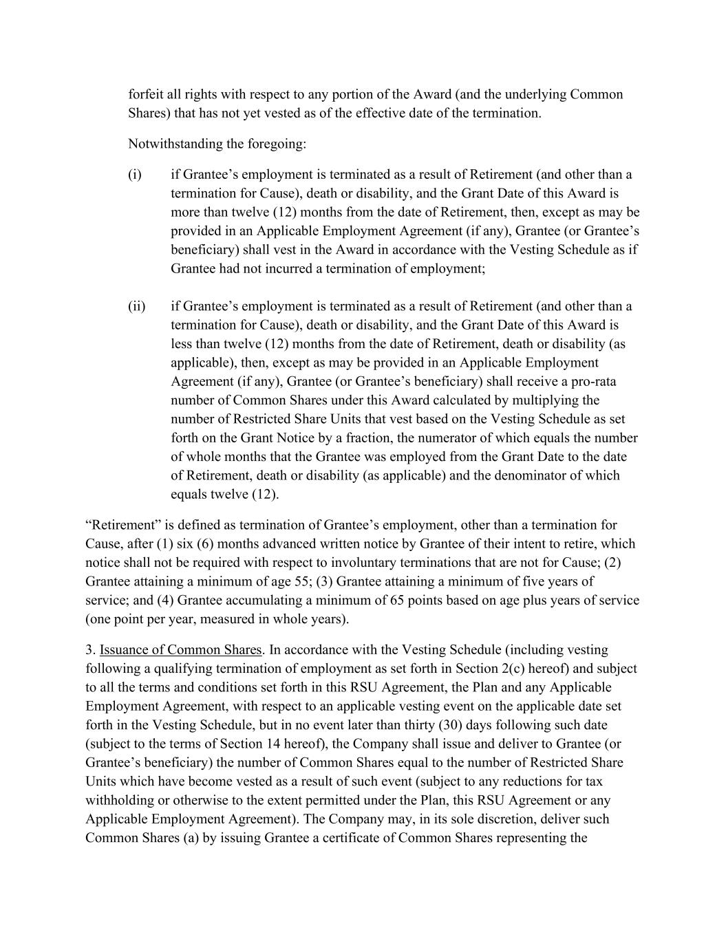 forfeit all rights with respect to any portion of the Award (and the underlying Common Shares) that has not yet vested as of the effective date of the termination. Notwithstanding the foregoing: (i) if Grantee’s employment is terminated as a result of Retirement (and other than a termination for Cause), death or disability, and the Grant Date of this Award is more than twelve (12) months from the date of Retirement, then, except as may be provided in an Applicable Employment Agreement (if any), Grantee (or Grantee’s beneficiary) shall vest in the Award in accordance with the Vesting Schedule as if Grantee had not incurred a termination of employment; (ii) if Grantee’s employment is terminated as a result of Retirement (and other than a termination for Cause), death or disability, and the Grant Date of this Award is less than twelve (12) months from the date of Retirement, death or disability (as applicable), then, except as may be provided in an Applicable Employment Agreement (if any), Grantee (or Grantee’s beneficiary) shall receive a pro-rata number of Common Shares under this Award calculated by multiplying the number of Restricted Share Units that vest based on the Vesting Schedule as set forth on the Grant Notice by a fraction, the numerator of which equals the number of whole months that the Grantee was employed from the Grant Date to the date of Retirement, death or disability (as applicable) and the denominator of which equals twelve (12). “Retirement” is defined as termination of Grantee’s employment, other than a termination for Cause, after (1) six (6) months advanced written notice by Grantee of their intent to retire, which notice shall not be required with respect to involuntary terminations that are not for Cause; (2) Grantee attaining a minimum of age 55; (3) Grantee attaining a minimum of five years of service; and (4) Grantee accumulating a minimum of 65 points based on age plus years of service (one point per year, measured in whole years). 3. Issuance of Common Shares. In accordance with the Vesting Schedule (including vesting following a qualifying termination of employment as set forth in Section 2(c) hereof) and subject to all the terms and conditions set forth in this RSU Agreement, the Plan and any Applicable Employment Agreement, with respect to an applicable vesting event on the applicable date set forth in the Vesting Schedule, but in no event later than thirty (30) days following such date (subject to the terms of Section 14 hereof), the Company shall issue and deliver to Grantee (or Grantee’s beneficiary) the number of Common Shares equal to the number of Restricted Share Units which have become vested as a result of such event (subject to any reductions for tax withholding or otherwise to the extent permitted under the Plan, this RSU Agreement or any Applicable Employment Agreement). The Company may, in its sole discretion, deliver such Common Shares (a) by issuing Grantee a certificate of Common Shares representing the