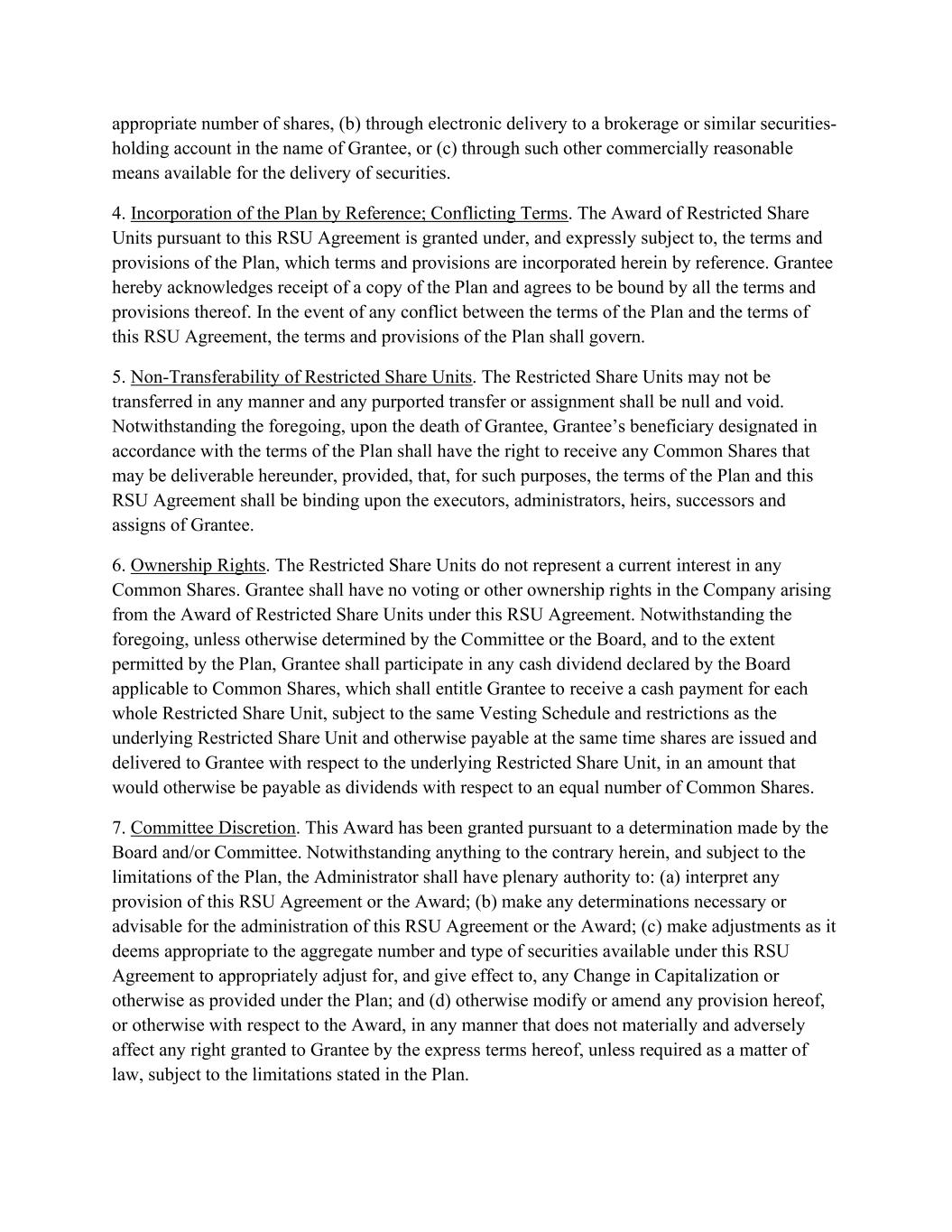 appropriate number of shares, (b) through electronic delivery to a brokerage or similar securities- holding account in the name of Grantee, or (c) through such other commercially reasonable means available for the delivery of securities. 4. Incorporation of the Plan by Reference; Conflicting Terms. The Award of Restricted Share Units pursuant to this RSU Agreement is granted under, and expressly subject to, the terms and provisions of the Plan, which terms and provisions are incorporated herein by reference. Grantee hereby acknowledges receipt of a copy of the Plan and agrees to be bound by all the terms and provisions thereof. In the event of any conflict between the terms of the Plan and the terms of this RSU Agreement, the terms and provisions of the Plan shall govern. 5. Non-Transferability of Restricted Share Units. The Restricted Share Units may not be transferred in any manner and any purported transfer or assignment shall be null and void. Notwithstanding the foregoing, upon the death of Grantee, Grantee’s beneficiary designated in accordance with the terms of the Plan shall have the right to receive any Common Shares that may be deliverable hereunder, provided, that, for such purposes, the terms of the Plan and this RSU Agreement shall be binding upon the executors, administrators, heirs, successors and assigns of Grantee. 6. Ownership Rights. The Restricted Share Units do not represent a current interest in any Common Shares. Grantee shall have no voting or other ownership rights in the Company arising from the Award of Restricted Share Units under this RSU Agreement. Notwithstanding the foregoing, unless otherwise determined by the Committee or the Board, and to the extent permitted by the Plan, Grantee shall participate in any cash dividend declared by the Board applicable to Common Shares, which shall entitle Grantee to receive a cash payment for each whole Restricted Share Unit, subject to the same Vesting Schedule and restrictions as the underlying Restricted Share Unit and otherwise payable at the same time shares are issued and delivered to Grantee with respect to the underlying Restricted Share Unit, in an amount that would otherwise be payable as dividends with respect to an equal number of Common Shares. 7. Committee Discretion. This Award has been granted pursuant to a determination made by the Board and/or Committee. Notwithstanding anything to the contrary herein, and subject to the limitations of the Plan, the Administrator shall have plenary authority to: (a) interpret any provision of this RSU Agreement or the Award; (b) make any determinations necessary or advisable for the administration of this RSU Agreement or the Award; (c) make adjustments as it deems appropriate to the aggregate number and type of securities available under this RSU Agreement to appropriately adjust for, and give effect to, any Change in Capitalization or otherwise as provided under the Plan; and (d) otherwise modify or amend any provision hereof, or otherwise with respect to the Award, in any manner that does not materially and adversely affect any right granted to Grantee by the express terms hereof, unless required as a matter of law, subject to the limitations stated in the Plan.