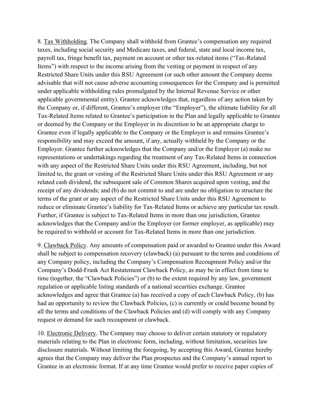 8. Tax Withholding. The Company shall withhold from Grantee’s compensation any required taxes, including social security and Medicare taxes, and federal, state and local income tax, payroll tax, fringe benefit tax, payment on account or other tax-related items (“Tax-Related Items”) with respect to the income arising from the vesting or payment in respect of any Restricted Share Units under this RSU Agreement (or such other amount the Company deems advisable that will not cause adverse accounting consequences for the Company and is permitted under applicable withholding rules promulgated by the Internal Revenue Service or other applicable governmental entity). Grantee acknowledges that, regardless of any action taken by the Company or, if different, Grantee’s employer (the “Employer”), the ultimate liability for all Tax-Related Items related to Grantee’s participation in the Plan and legally applicable to Grantee or deemed by the Company or the Employer in its discretion to be an appropriate charge to Grantee even if legally applicable to the Company or the Employer is and remains Grantee’s responsibility and may exceed the amount, if any, actually withheld by the Company or the Employer. Grantee further acknowledges that the Company and/or the Employer (a) make no representations or undertakings regarding the treatment of any Tax-Related Items in connection with any aspect of the Restricted Share Units under this RSU Agreement, including, but not limited to, the grant or vesting of the Restricted Share Units under this RSU Agreement or any related cash dividend, the subsequent sale of Common Shares acquired upon vesting, and the receipt of any dividends; and (b) do not commit to and are under no obligation to structure the terms of the grant or any aspect of the Restricted Share Units under this RSU Agreement to reduce or eliminate Grantee’s liability for Tax-Related Items or achieve any particular tax result. Further, if Grantee is subject to Tax-Related Items in more than one jurisdiction, Grantee acknowledges that the Company and/or the Employer (or former employer, as applicable) may be required to withhold or account for Tax-Related Items in more than one jurisdiction. 9. Clawback Policy. Any amounts of compensation paid or awarded to Grantee under this Award shall be subject to compensation recovery (clawback) (a) pursuant to the terms and conditions of any Company policy, including the Company’s Compensation Recoupment Policy and/or the Company’s Dodd-Frank Act Restatement Clawback Policy, as may be in effect from time to time (together, the “Clawback Policies”) or (b) to the extent required by any law, government regulation or applicable listing standards of a national securities exchange. Grantee acknowledges and agree that Grantee (a) has received a copy of each Clawback Policy, (b) has had an opportunity to review the Clawback Policies, (c) is currently or could become bound by all the terms and conditions of the Clawback Policies and (d) will comply with any Company request or demand for such recoupment or clawback. 10. Electronic Delivery. The Company may choose to deliver certain statutory or regulatory materials relating to the Plan in electronic form, including, without limitation, securities law disclosure materials. Without limiting the foregoing, by accepting this Award, Grantee hereby agrees that the Company may deliver the Plan prospectus and the Company’s annual report to Grantee in an electronic format. If at any time Grantee would prefer to receive paper copies of