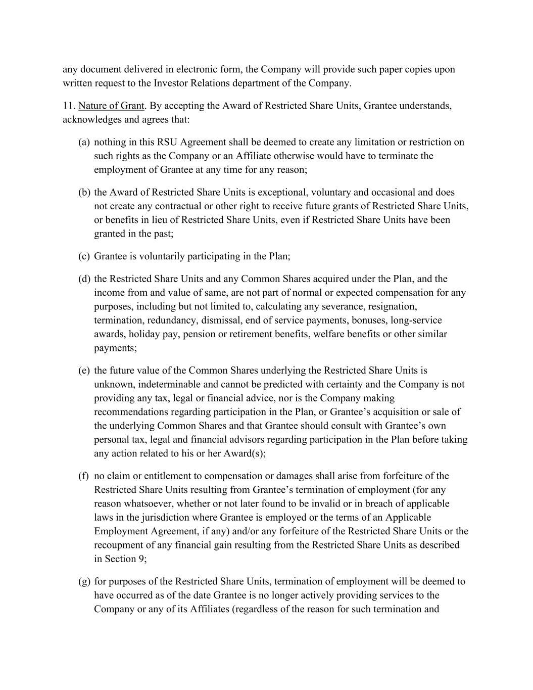 any document delivered in electronic form, the Company will provide such paper copies upon written request to the Investor Relations department of the Company. 11. Nature of Grant. By accepting the Award of Restricted Share Units, Grantee understands, acknowledges and agrees that: (a) nothing in this RSU Agreement shall be deemed to create any limitation or restriction on such rights as the Company or an Affiliate otherwise would have to terminate the employment of Grantee at any time for any reason; (b) the Award of Restricted Share Units is exceptional, voluntary and occasional and does not create any contractual or other right to receive future grants of Restricted Share Units, or benefits in lieu of Restricted Share Units, even if Restricted Share Units have been granted in the past; (c) Grantee is voluntarily participating in the Plan; (d) the Restricted Share Units and any Common Shares acquired under the Plan, and the income from and value of same, are not part of normal or expected compensation for any purposes, including but not limited to, calculating any severance, resignation, termination, redundancy, dismissal, end of service payments, bonuses, long-service awards, holiday pay, pension or retirement benefits, welfare benefits or other similar payments; (e) the future value of the Common Shares underlying the Restricted Share Units is unknown, indeterminable and cannot be predicted with certainty and the Company is not providing any tax, legal or financial advice, nor is the Company making recommendations regarding participation in the Plan, or Grantee’s acquisition or sale of the underlying Common Shares and that Grantee should consult with Grantee’s own personal tax, legal and financial advisors regarding participation in the Plan before taking any action related to his or her Award(s); (f) no claim or entitlement to compensation or damages shall arise from forfeiture of the Restricted Share Units resulting from Grantee’s termination of employment (for any reason whatsoever, whether or not later found to be invalid or in breach of applicable laws in the jurisdiction where Grantee is employed or the terms of an Applicable Employment Agreement, if any) and/or any forfeiture of the Restricted Share Units or the recoupment of any financial gain resulting from the Restricted Share Units as described in Section 9; (g) for purposes of the Restricted Share Units, termination of employment will be deemed to have occurred as of the date Grantee is no longer actively providing services to the Company or any of its Affiliates (regardless of the reason for such termination and
