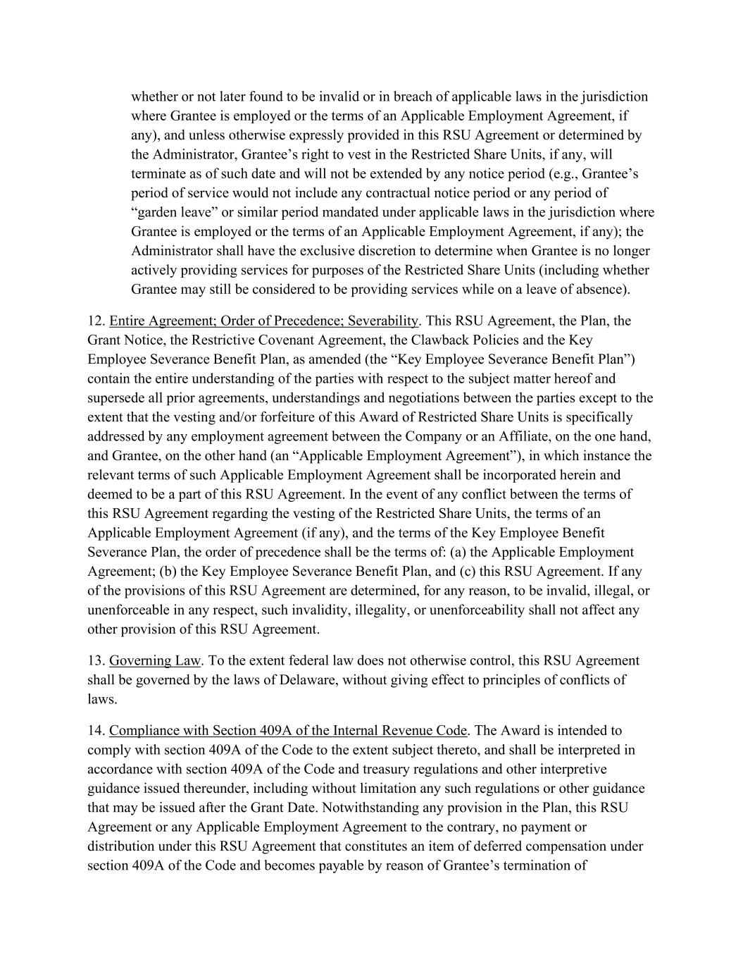 whether or not later found to be invalid or in breach of applicable laws in the jurisdiction where Grantee is employed or the terms of an Applicable Employment Agreement, if any), and unless otherwise expressly provided in this RSU Agreement or determined by the Administrator, Grantee’s right to vest in the Restricted Share Units, if any, will terminate as of such date and will not be extended by any notice period (e.g., Grantee’s period of service would not include any contractual notice period or any period of “garden leave” or similar period mandated under applicable laws in the jurisdiction where Grantee is employed or the terms of an Applicable Employment Agreement, if any); the Administrator shall have the exclusive discretion to determine when Grantee is no longer actively providing services for purposes of the Restricted Share Units (including whether Grantee may still be considered to be providing services while on a leave of absence). 12. Entire Agreement; Order of Precedence; Severability. This RSU Agreement, the Plan, the Grant Notice, the Restrictive Covenant Agreement, the Clawback Policies and the Key Employee Severance Benefit Plan, as amended (the “Key Employee Severance Benefit Plan”) contain the entire understanding of the parties with respect to the subject matter hereof and supersede all prior agreements, understandings and negotiations between the parties except to the extent that the vesting and/or forfeiture of this Award of Restricted Share Units is specifically addressed by any employment agreement between the Company or an Affiliate, on the one hand, and Grantee, on the other hand (an “Applicable Employment Agreement”), in which instance the relevant terms of such Applicable Employment Agreement shall be incorporated herein and deemed to be a part of this RSU Agreement. In the event of any conflict between the terms of this RSU Agreement regarding the vesting of the Restricted Share Units, the terms of an Applicable Employment Agreement (if any), and the terms of the Key Employee Benefit Severance Plan, the order of precedence shall be the terms of: (a) the Applicable Employment Agreement; (b) the Key Employee Severance Benefit Plan, and (c) this RSU Agreement. If any of the provisions of this RSU Agreement are determined, for any reason, to be invalid, illegal, or unenforceable in any respect, such invalidity, illegality, or unenforceability shall not affect any other provision of this RSU Agreement. 13. Governing Law. To the extent federal law does not otherwise control, this RSU Agreement shall be governed by the laws of Delaware, without giving effect to principles of conflicts of laws. 14. Compliance with Section 409A of the Internal Revenue Code. The Award is intended to comply with section 409A of the Code to the extent subject thereto, and shall be interpreted in accordance with section 409A of the Code and treasury regulations and other interpretive guidance issued thereunder, including without limitation any such regulations or other guidance that may be issued after the Grant Date. Notwithstanding any provision in the Plan, this RSU Agreement or any Applicable Employment Agreement to the contrary, no payment or distribution under this RSU Agreement that constitutes an item of deferred compensation under section 409A of the Code and becomes payable by reason of Grantee’s termination of