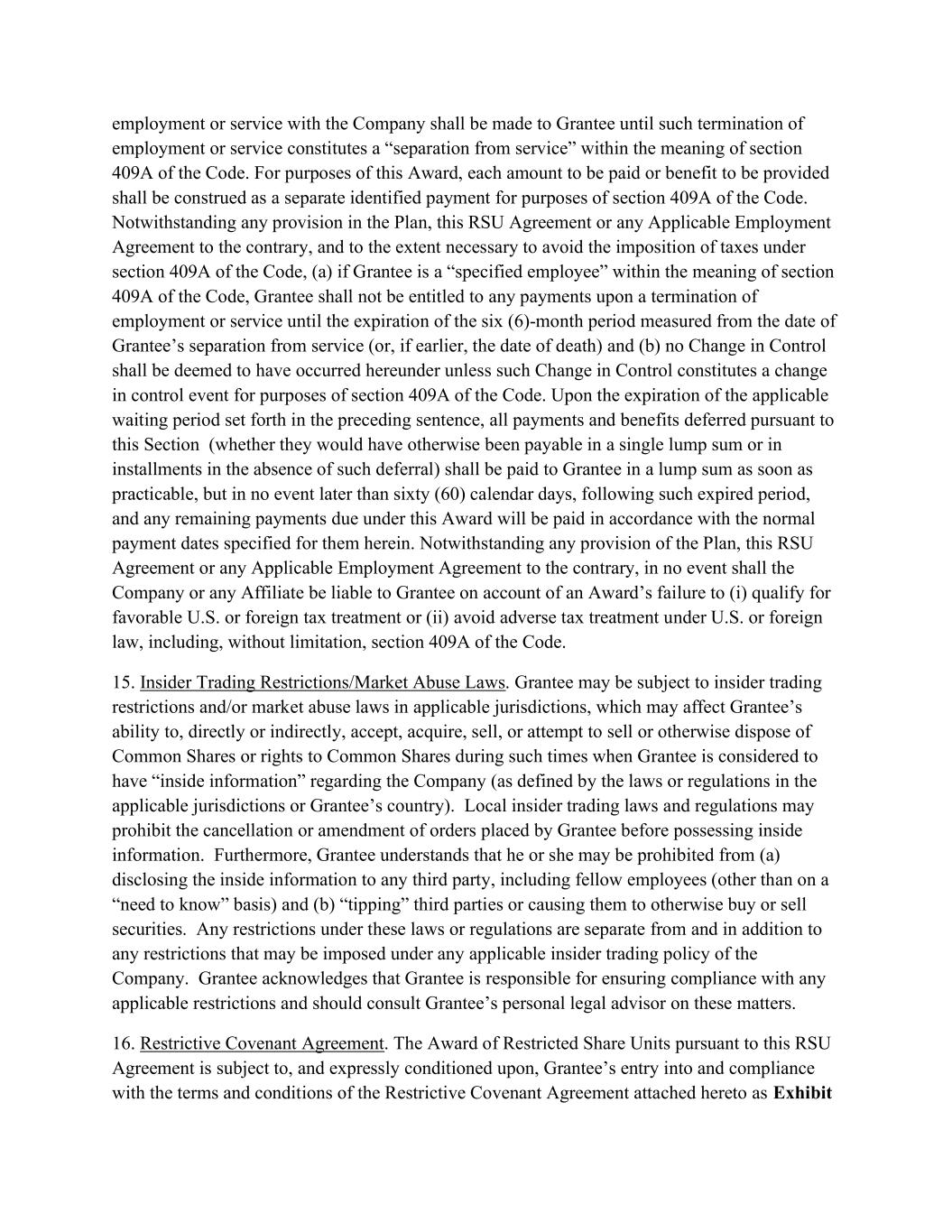employment or service with the Company shall be made to Grantee until such termination of employment or service constitutes a “separation from service” within the meaning of section 409A of the Code. For purposes of this Award, each amount to be paid or benefit to be provided shall be construed as a separate identified payment for purposes of section 409A of the Code. Notwithstanding any provision in the Plan, this RSU Agreement or any Applicable Employment Agreement to the contrary, and to the extent necessary to avoid the imposition of taxes under section 409A of the Code, (a) if Grantee is a “specified employee” within the meaning of section 409A of the Code, Grantee shall not be entitled to any payments upon a termination of employment or service until the expiration of the six (6)-month period measured from the date of Grantee’s separation from service (or, if earlier, the date of death) and (b) no Change in Control shall be deemed to have occurred hereunder unless such Change in Control constitutes a change in control event for purposes of section 409A of the Code. Upon the expiration of the applicable waiting period set forth in the preceding sentence, all payments and benefits deferred pursuant to this Section (whether they would have otherwise been payable in a single lump sum or in installments in the absence of such deferral) shall be paid to Grantee in a lump sum as soon as practicable, but in no event later than sixty (60) calendar days, following such expired period, and any remaining payments due under this Award will be paid in accordance with the normal payment dates specified for them herein. Notwithstanding any provision of the Plan, this RSU Agreement or any Applicable Employment Agreement to the contrary, in no event shall the Company or any Affiliate be liable to Grantee on account of an Award’s failure to (i) qualify for favorable U.S. or foreign tax treatment or (ii) avoid adverse tax treatment under U.S. or foreign law, including, without limitation, section 409A of the Code. 15. Insider Trading Restrictions/Market Abuse Laws. Grantee may be subject to insider trading restrictions and/or market abuse laws in applicable jurisdictions, which may affect Grantee’s ability to, directly or indirectly, accept, acquire, sell, or attempt to sell or otherwise dispose of Common Shares or rights to Common Shares during such times when Grantee is considered to have “inside information” regarding the Company (as defined by the laws or regulations in the applicable jurisdictions or Grantee’s country). Local insider trading laws and regulations may prohibit the cancellation or amendment of orders placed by Grantee before possessing inside information. Furthermore, Grantee understands that he or she may be prohibited from (a) disclosing the inside information to any third party, including fellow employees (other than on a “need to know” basis) and (b) “tipping” third parties or causing them to otherwise buy or sell securities. Any restrictions under these laws or regulations are separate from and in addition to any restrictions that may be imposed under any applicable insider trading policy of the Company. Grantee acknowledges that Grantee is responsible for ensuring compliance with any applicable restrictions and should consult Grantee’s personal legal advisor on these matters. 16. Restrictive Covenant Agreement. The Award of Restricted Share Units pursuant to this RSU Agreement is subject to, and expressly conditioned upon, Grantee’s entry into and compliance with the terms and conditions of the Restrictive Covenant Agreement attached hereto as Exhibit