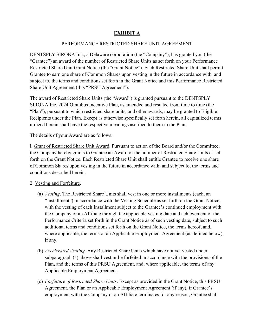 EXHIBIT A PERFORMANCE RESTRICTED SHARE UNIT AGREEMENT DENTSPLY SIRONA Inc., a Delaware corporation (the “Company”), has granted you (the “Grantee”) an award of the number of Restricted Share Units as set forth on your Performance Restricted Share Unit Grant Notice (the “Grant Notice”). Each Restricted Share Unit shall permit Grantee to earn one share of Common Shares upon vesting in the future in accordance with, and subject to, the terms and conditions set forth in the Grant Notice and this Performance Restricted Share Unit Agreement (this “PRSU Agreement”). The award of Restricted Share Units (the “Award”) is granted pursuant to the DENTSPLY SIRONA Inc. 2024 Omnibus Incentive Plan, as amended and restated from time to time (the “Plan”), pursuant to which restricted share units, and other awards, may be granted to Eligible Recipients under the Plan. Except as otherwise specifically set forth herein, all capitalized terms utilized herein shall have the respective meanings ascribed to them in the Plan. The details of your Award are as follows: l. Grant of Restricted Share Unit Award. Pursuant to action of the Board and/or the Committee, the Company hereby grants to Grantee an Award of the number of Restricted Share Units as set forth on the Grant Notice. Each Restricted Share Unit shall entitle Grantee to receive one share of Common Shares upon vesting in the future in accordance with, and subject to, the terms and conditions described herein. 2. Vesting and Forfeiture. (a) Vesting. The Restricted Share Units shall vest in one or more installments (each, an “Installment”) in accordance with the Vesting Schedule as set forth on the Grant Notice, with the vesting of each Installment subject to the Grantee’s continued employment with the Company or an Affiliate through the applicable vesting date and achievement of the Performance Criteria set forth in the Grant Notice as of such vesting date, subject to such additional terms and conditions set forth on the Grant Notice, the terms hereof, and, where applicable, the terms of an Applicable Employment Agreement (as defined below), if any. (b) Accelerated Vesting. Any Restricted Share Units which have not yet vested under subparagraph (a) above shall vest or be forfeited in accordance with the provisions of the Plan, and the terms of this PRSU Agreement, and, where applicable, the terms of any Applicable Employment Agreement. (c) Forfeiture of Restricted Share Units. Except as provided in the Grant Notice, this PRSU Agreement, the Plan or an Applicable Employment Agreement (if any), if Grantee’s employment with the Company or an Affiliate terminates for any reason, Grantee shall