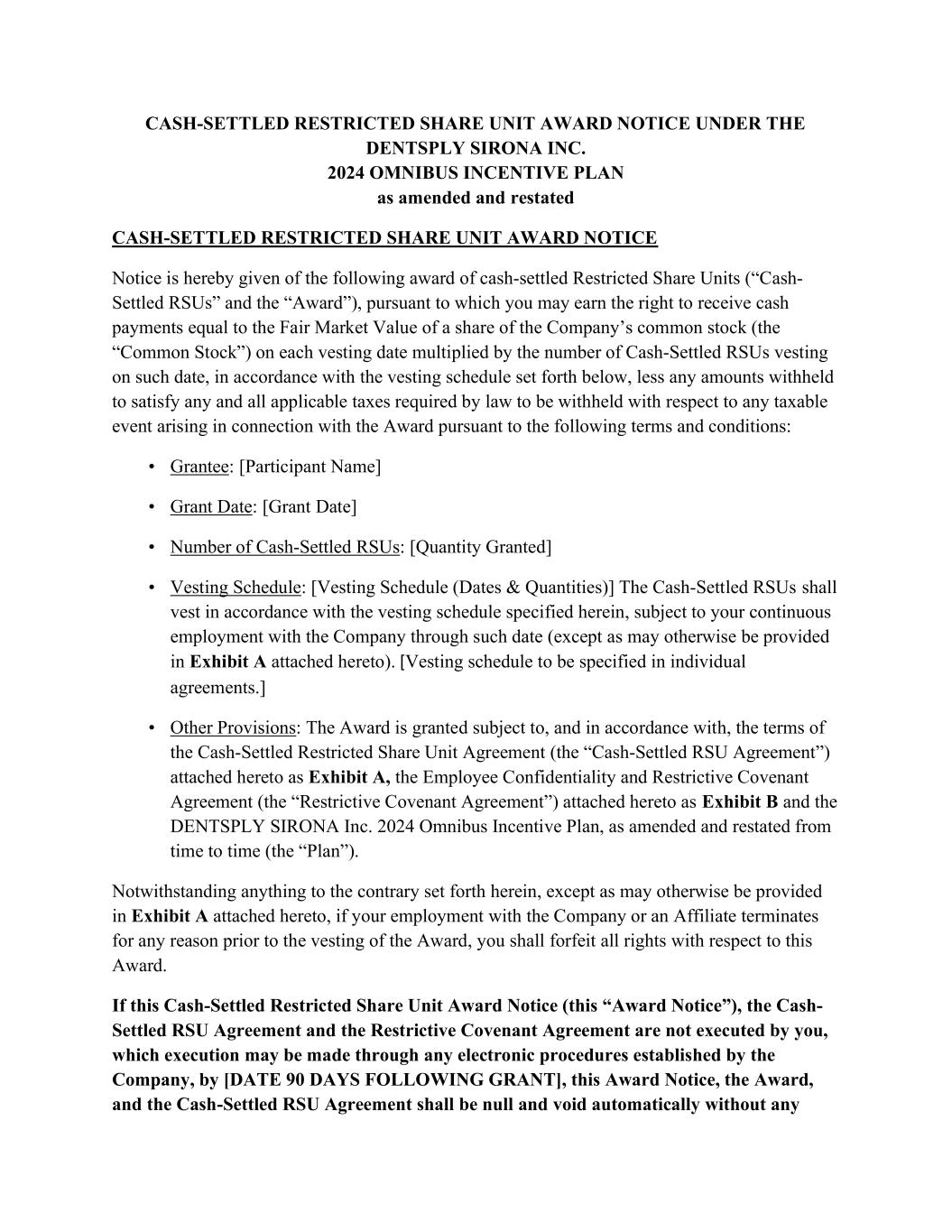 CASH-SETTLED RESTRICTED SHARE UNIT AWARD NOTICE UNDER THE DENTSPLY SIRONA INC. 2024 OMNIBUS INCENTIVE PLAN as amended and restated CASH-SETTLED RESTRICTED SHARE UNIT AWARD NOTICE Notice is hereby given of the following award of cash-settled Restricted Share Units (“Cash- Settled RSUs” and the “Award”), pursuant to which you may earn the right to receive cash payments equal to the Fair Market Value of a share of the Company’s common stock (the “Common Stock”) on each vesting date multiplied by the number of Cash-Settled RSUs vesting on such date, in accordance with the vesting schedule set forth below, less any amounts withheld to satisfy any and all applicable taxes required by law to be withheld with respect to any taxable event arising in connection with the Award pursuant to the following terms and conditions: • Grantee: [Participant Name] • Grant Date: [Grant Date] • Number of Cash-Settled RSUs: [Quantity Granted] • Vesting Schedule: [Vesting Schedule (Dates & Quantities)] The Cash-Settled RSUs shall vest in accordance with the vesting schedule specified herein, subject to your continuous employment with the Company through such date (except as may otherwise be provided in Exhibit A attached hereto). [Vesting schedule to be specified in individual agreements.] • Other Provisions: The Award is granted subject to, and in accordance with, the terms of the Cash-Settled Restricted Share Unit Agreement (the “Cash-Settled RSU Agreement”) attached hereto as Exhibit A, the Employee Confidentiality and Restrictive Covenant Agreement (the “Restrictive Covenant Agreement”) attached hereto as Exhibit B and the DENTSPLY SIRONA Inc. 2024 Omnibus Incentive Plan, as amended and restated from time to time (the “Plan”). Notwithstanding anything to the contrary set forth herein, except as may otherwise be provided in Exhibit A attached hereto, if your employment with the Company or an Affiliate terminates for any reason prior to the vesting of the Award, you shall forfeit all rights with respect to this Award. If this Cash-Settled Restricted Share Unit Award Notice (this “Award Notice”), the Cash- Settled RSU Agreement and the Restrictive Covenant Agreement are not executed by you, which execution may be made through any electronic procedures established by the Company, by [DATE 90 DAYS FOLLOWING GRANT], this Award Notice, the Award, and the Cash-Settled RSU Agreement shall be null and void automatically without any