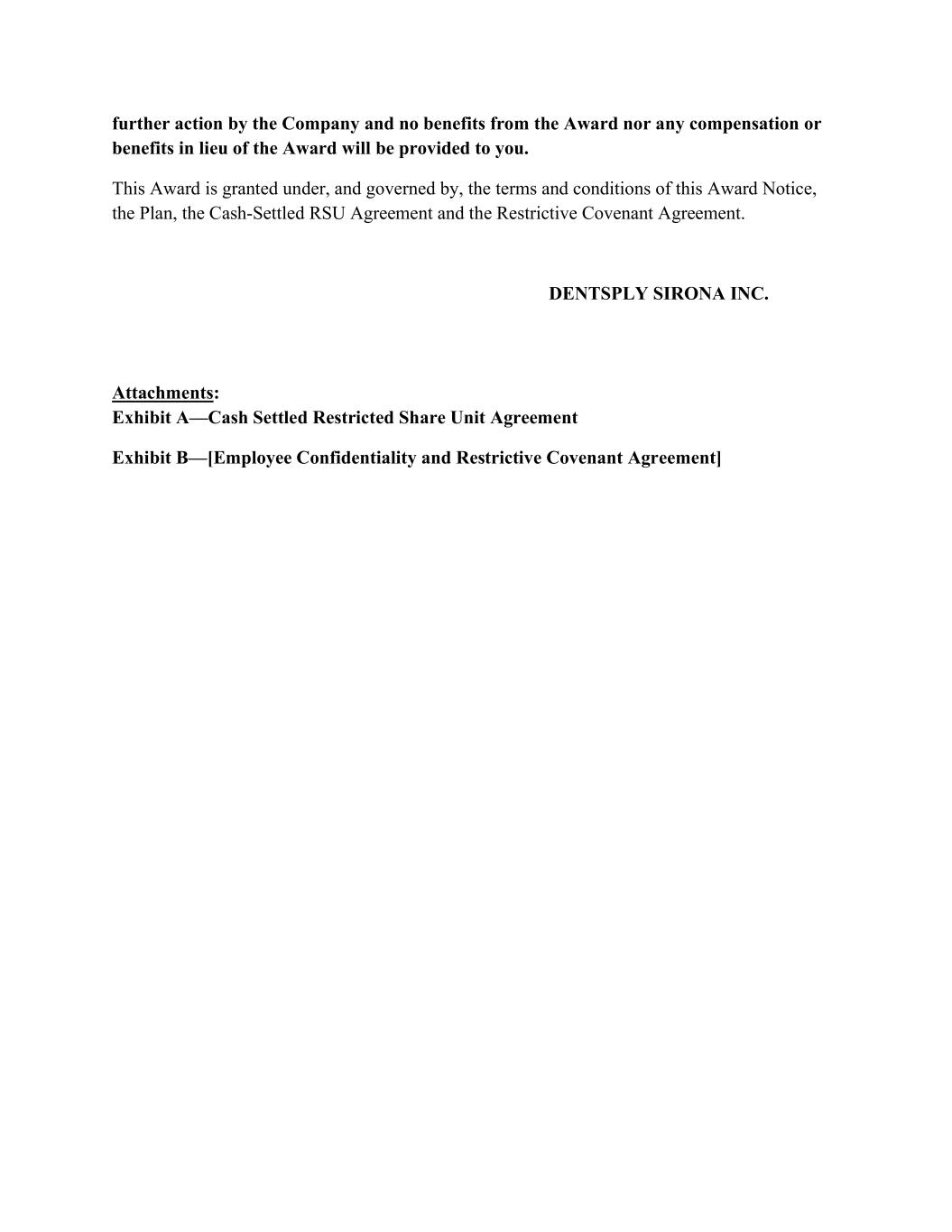further action by the Company and no benefits from the Award nor any compensation or benefits in lieu of the Award will be provided to you. This Award is granted under, and governed by, the terms and conditions of this Award Notice, the Plan, the Cash-Settled RSU Agreement and the Restrictive Covenant Agreement. DENTSPLY SIRONA INC. Attachments: Exhibit A—Cash Settled Restricted Share Unit Agreement Exhibit B—[Employee Confidentiality and Restrictive Covenant Agreement]