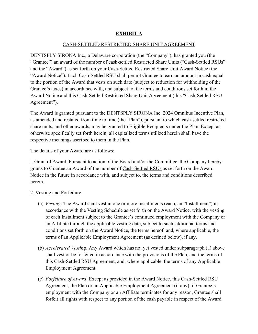EXHIBIT A CASH-SETTLED RESTRICTED SHARE UNIT AGREEMENT DENTSPLY SIRONA Inc., a Delaware corporation (the “Company”), has granted you (the “Grantee”) an award of the number of cash-settled Restricted Share Units (“Cash-Settled RSUs” and the “Award”) as set forth on your Cash-Settled Restricted Share Unit Award Notice (the “Award Notice”). Each Cash-Settled RSU shall permit Grantee to earn an amount in cash equal to the portion of the Award that vests on such date (subject to reduction for withholding of the Grantee’s taxes) in accordance with, and subject to, the terms and conditions set forth in the Award Notice and this Cash-Settled Restricted Share Unit Agreement (this “Cash-Settled RSU Agreement”). The Award is granted pursuant to the DENTSPLY SIRONA Inc. 2024 Omnibus Incentive Plan, as amended and restated from time to time (the “Plan”), pursuant to which cash-settled restricted share units, and other awards, may be granted to Eligible Recipients under the Plan. Except as otherwise specifically set forth herein, all capitalized terms utilized herein shall have the respective meanings ascribed to them in the Plan. The details of your Award are as follows: l. Grant of Award. Pursuant to action of the Board and/or the Committee, the Company hereby grants to Grantee an Award of the number of Cash-Settled RSUs as set forth on the Award Notice in the future in accordance with, and subject to, the terms and conditions described herein. 2. Vesting and Forfeiture. (a) Vesting. The Award shall vest in one or more installments (each, an “Installment”) in accordance with the Vesting Schedule as set forth on the Award Notice, with the vesting of each Installment subject to the Grantee’s continued employment with the Company or an Affiliate through the applicable vesting date, subject to such additional terms and conditions set forth on the Award Notice, the terms hereof, and, where applicable, the terms of an Applicable Employment Agreement (as defined below), if any. (b) Accelerated Vesting. Any Award which has not yet vested under subparagraph (a) above shall vest or be forfeited in accordance with the provisions of the Plan, and the terms of this Cash-Settled RSU Agreement, and, where applicable, the terms of any Applicable Employment Agreement. (c) Forfeiture of Award. Except as provided in the Award Notice, this Cash-Settled RSU Agreement, the Plan or an Applicable Employment Agreement (if any), if Grantee’s employment with the Company or an Affiliate terminates for any reason, Grantee shall forfeit all rights with respect to any portion of the cash payable in respect of the Award