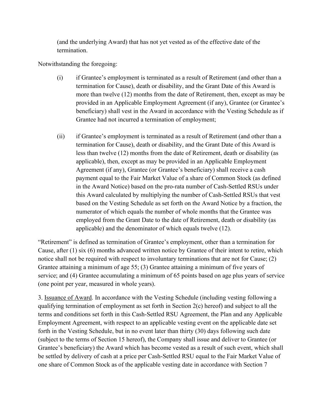 (and the underlying Award) that has not yet vested as of the effective date of the termination. Notwithstanding the foregoing: (i) if Grantee’s employment is terminated as a result of Retirement (and other than a termination for Cause), death or disability, and the Grant Date of this Award is more than twelve (12) months from the date of Retirement, then, except as may be provided in an Applicable Employment Agreement (if any), Grantee (or Grantee’s beneficiary) shall vest in the Award in accordance with the Vesting Schedule as if Grantee had not incurred a termination of employment; (ii) if Grantee’s employment is terminated as a result of Retirement (and other than a termination for Cause), death or disability, and the Grant Date of this Award is less than twelve (12) months from the date of Retirement, death or disability (as applicable), then, except as may be provided in an Applicable Employment Agreement (if any), Grantee (or Grantee’s beneficiary) shall receive a cash payment equal to the Fair Market Value of a share of Common Stock (as defined in the Award Notice) based on the pro-rata number of Cash-Settled RSUs under this Award calculated by multiplying the number of Cash-Settled RSUs that vest based on the Vesting Schedule as set forth on the Award Notice by a fraction, the numerator of which equals the number of whole months that the Grantee was employed from the Grant Date to the date of Retirement, death or disability (as applicable) and the denominator of which equals twelve (12). “Retirement” is defined as termination of Grantee’s employment, other than a termination for Cause, after (1) six (6) months advanced written notice by Grantee of their intent to retire, which notice shall not be required with respect to involuntary terminations that are not for Cause; (2) Grantee attaining a minimum of age 55; (3) Grantee attaining a minimum of five years of service; and (4) Grantee accumulating a minimum of 65 points based on age plus years of service (one point per year, measured in whole years). 3. Issuance of Award. In accordance with the Vesting Schedule (including vesting following a qualifying termination of employment as set forth in Section 2(c) hereof) and subject to all the terms and conditions set forth in this Cash-Settled RSU Agreement, the Plan and any Applicable Employment Agreement, with respect to an applicable vesting event on the applicable date set forth in the Vesting Schedule, but in no event later than thirty (30) days following such date (subject to the terms of Section 15 hereof), the Company shall issue and deliver to Grantee (or Grantee’s beneficiary) the Award which has become vested as a result of such event, which shall be settled by delivery of cash at a price per Cash-Settled RSU equal to the Fair Market Value of one share of Common Stock as of the applicable vesting date in accordance with Section 7