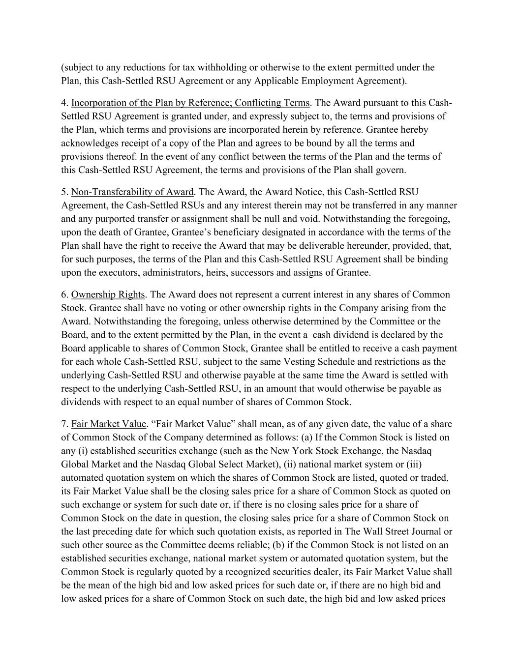 (subject to any reductions for tax withholding or otherwise to the extent permitted under the Plan, this Cash-Settled RSU Agreement or any Applicable Employment Agreement). 4. Incorporation of the Plan by Reference; Conflicting Terms. The Award pursuant to this Cash- Settled RSU Agreement is granted under, and expressly subject to, the terms and provisions of the Plan, which terms and provisions are incorporated herein by reference. Grantee hereby acknowledges receipt of a copy of the Plan and agrees to be bound by all the terms and provisions thereof. In the event of any conflict between the terms of the Plan and the terms of this Cash-Settled RSU Agreement, the terms and provisions of the Plan shall govern. 5. Non-Transferability of Award. The Award, the Award Notice, this Cash-Settled RSU Agreement, the Cash-Settled RSUs and any interest therein may not be transferred in any manner and any purported transfer or assignment shall be null and void. Notwithstanding the foregoing, upon the death of Grantee, Grantee’s beneficiary designated in accordance with the terms of the Plan shall have the right to receive the Award that may be deliverable hereunder, provided, that, for such purposes, the terms of the Plan and this Cash-Settled RSU Agreement shall be binding upon the executors, administrators, heirs, successors and assigns of Grantee. 6. Ownership Rights. The Award does not represent a current interest in any shares of Common Stock. Grantee shall have no voting or other ownership rights in the Company arising from the Award. Notwithstanding the foregoing, unless otherwise determined by the Committee or the Board, and to the extent permitted by the Plan, in the event a cash dividend is declared by the Board applicable to shares of Common Stock, Grantee shall be entitled to receive a cash payment for each whole Cash-Settled RSU, subject to the same Vesting Schedule and restrictions as the underlying Cash-Settled RSU and otherwise payable at the same time the Award is settled with respect to the underlying Cash-Settled RSU, in an amount that would otherwise be payable as dividends with respect to an equal number of shares of Common Stock. 7. Fair Market Value. “Fair Market Value” shall mean, as of any given date, the value of a share of Common Stock of the Company determined as follows: (a) If the Common Stock is listed on any (i) established securities exchange (such as the New York Stock Exchange, the Nasdaq Global Market and the Nasdaq Global Select Market), (ii) national market system or (iii) automated quotation system on which the shares of Common Stock are listed, quoted or traded, its Fair Market Value shall be the closing sales price for a share of Common Stock as quoted on such exchange or system for such date or, if there is no closing sales price for a share of Common Stock on the date in question, the closing sales price for a share of Common Stock on the last preceding date for which such quotation exists, as reported in The Wall Street Journal or such other source as the Committee deems reliable; (b) if the Common Stock is not listed on an established securities exchange, national market system or automated quotation system, but the Common Stock is regularly quoted by a recognized securities dealer, its Fair Market Value shall be the mean of the high bid and low asked prices for such date or, if there are no high bid and low asked prices for a share of Common Stock on such date, the high bid and low asked prices