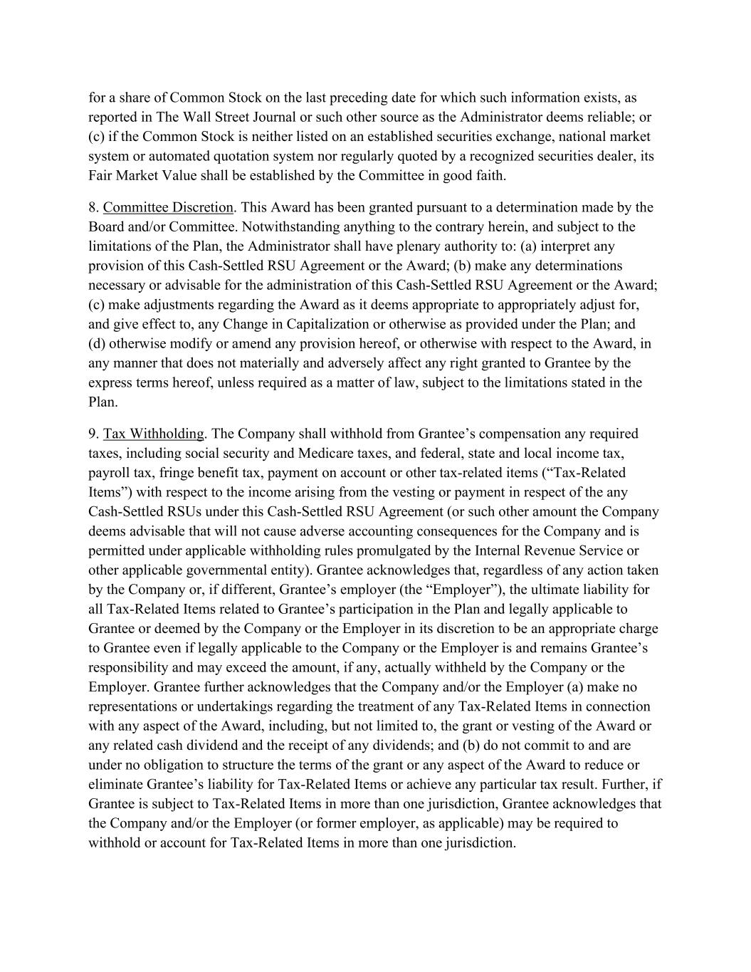 for a share of Common Stock on the last preceding date for which such information exists, as reported in The Wall Street Journal or such other source as the Administrator deems reliable; or (c) if the Common Stock is neither listed on an established securities exchange, national market system or automated quotation system nor regularly quoted by a recognized securities dealer, its Fair Market Value shall be established by the Committee in good faith. 8. Committee Discretion. This Award has been granted pursuant to a determination made by the Board and/or Committee. Notwithstanding anything to the contrary herein, and subject to the limitations of the Plan, the Administrator shall have plenary authority to: (a) interpret any provision of this Cash-Settled RSU Agreement or the Award; (b) make any determinations necessary or advisable for the administration of this Cash-Settled RSU Agreement or the Award; (c) make adjustments regarding the Award as it deems appropriate to appropriately adjust for, and give effect to, any Change in Capitalization or otherwise as provided under the Plan; and (d) otherwise modify or amend any provision hereof, or otherwise with respect to the Award, in any manner that does not materially and adversely affect any right granted to Grantee by the express terms hereof, unless required as a matter of law, subject to the limitations stated in the Plan. 9. Tax Withholding. The Company shall withhold from Grantee’s compensation any required taxes, including social security and Medicare taxes, and federal, state and local income tax, payroll tax, fringe benefit tax, payment on account or other tax-related items (“Tax-Related Items”) with respect to the income arising from the vesting or payment in respect of the any Cash-Settled RSUs under this Cash-Settled RSU Agreement (or such other amount the Company deems advisable that will not cause adverse accounting consequences for the Company and is permitted under applicable withholding rules promulgated by the Internal Revenue Service or other applicable governmental entity). Grantee acknowledges that, regardless of any action taken by the Company or, if different, Grantee’s employer (the “Employer”), the ultimate liability for all Tax-Related Items related to Grantee’s participation in the Plan and legally applicable to Grantee or deemed by the Company or the Employer in its discretion to be an appropriate charge to Grantee even if legally applicable to the Company or the Employer is and remains Grantee’s responsibility and may exceed the amount, if any, actually withheld by the Company or the Employer. Grantee further acknowledges that the Company and/or the Employer (a) make no representations or undertakings regarding the treatment of any Tax-Related Items in connection with any aspect of the Award, including, but not limited to, the grant or vesting of the Award or any related cash dividend and the receipt of any dividends; and (b) do not commit to and are under no obligation to structure the terms of the grant or any aspect of the Award to reduce or eliminate Grantee’s liability for Tax-Related Items or achieve any particular tax result. Further, if Grantee is subject to Tax-Related Items in more than one jurisdiction, Grantee acknowledges that the Company and/or the Employer (or former employer, as applicable) may be required to withhold or account for Tax-Related Items in more than one jurisdiction.