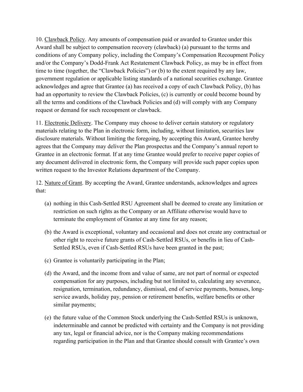 10. Clawback Policy. Any amounts of compensation paid or awarded to Grantee under this Award shall be subject to compensation recovery (clawback) (a) pursuant to the terms and conditions of any Company policy, including the Company’s Compensation Recoupment Policy and/or the Company’s Dodd-Frank Act Restatement Clawback Policy, as may be in effect from time to time (together, the “Clawback Policies”) or (b) to the extent required by any law, government regulation or applicable listing standards of a national securities exchange. Grantee acknowledges and agree that Grantee (a) has received a copy of each Clawback Policy, (b) has had an opportunity to review the Clawback Policies, (c) is currently or could become bound by all the terms and conditions of the Clawback Policies and (d) will comply with any Company request or demand for such recoupment or clawback. 11. Electronic Delivery. The Company may choose to deliver certain statutory or regulatory materials relating to the Plan in electronic form, including, without limitation, securities law disclosure materials. Without limiting the foregoing, by accepting this Award, Grantee hereby agrees that the Company may deliver the Plan prospectus and the Company’s annual report to Grantee in an electronic format. If at any time Grantee would prefer to receive paper copies of any document delivered in electronic form, the Company will provide such paper copies upon written request to the Investor Relations department of the Company. 12. Nature of Grant. By accepting the Award, Grantee understands, acknowledges and agrees that: (a) nothing in this Cash-Settled RSU Agreement shall be deemed to create any limitation or restriction on such rights as the Company or an Affiliate otherwise would have to terminate the employment of Grantee at any time for any reason; (b) the Award is exceptional, voluntary and occasional and does not create any contractual or other right to receive future grants of Cash-Settled RSUs, or benefits in lieu of Cash- Settled RSUs, even if Cash-Settled RSUs have been granted in the past; (c) Grantee is voluntarily participating in the Plan; (d) the Award, and the income from and value of same, are not part of normal or expected compensation for any purposes, including but not limited to, calculating any severance, resignation, termination, redundancy, dismissal, end of service payments, bonuses, long- service awards, holiday pay, pension or retirement benefits, welfare benefits or other similar payments; (e) the future value of the Common Stock underlying the Cash-Settled RSUs is unknown, indeterminable and cannot be predicted with certainty and the Company is not providing any tax, legal or financial advice, nor is the Company making recommendations regarding participation in the Plan and that Grantee should consult with Grantee’s own
