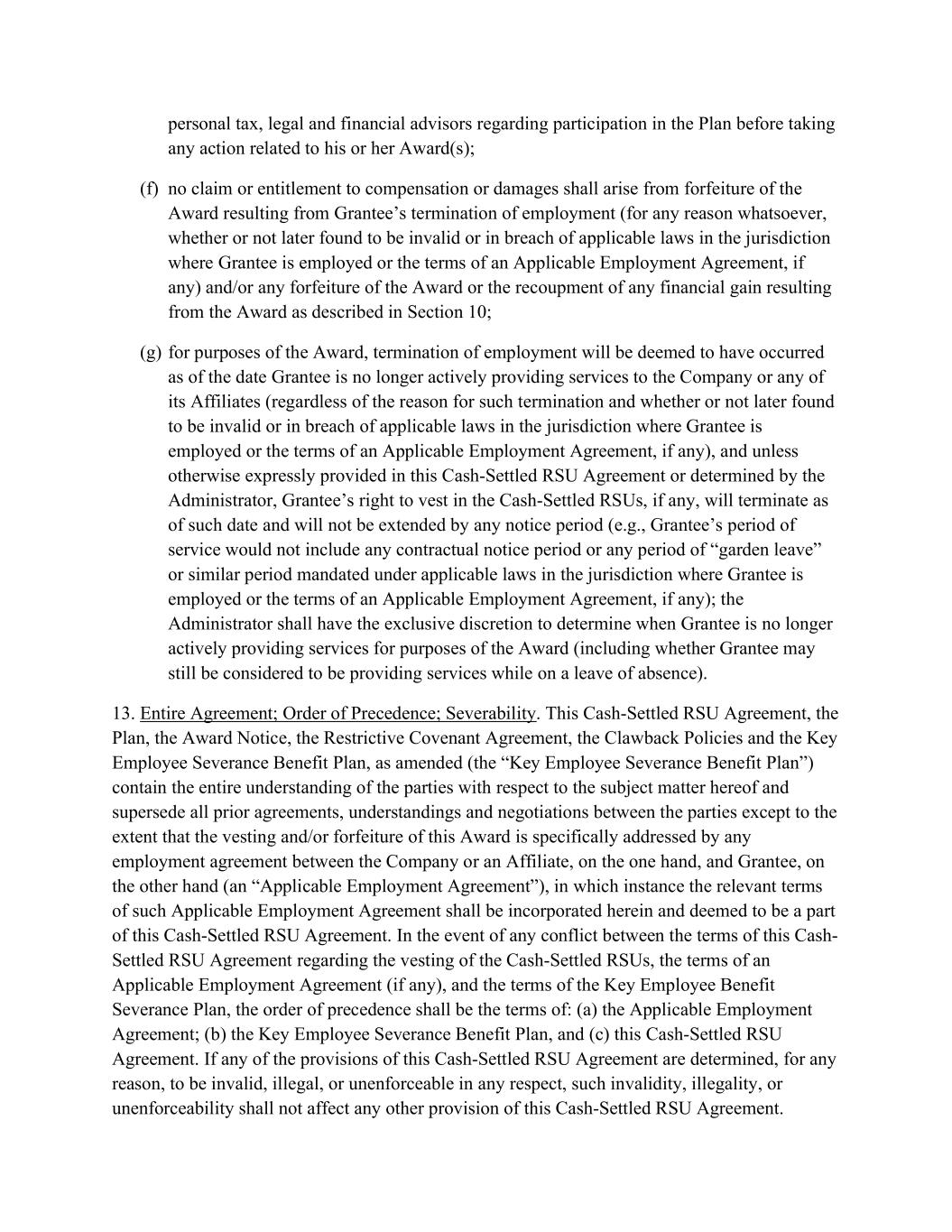 personal tax, legal and financial advisors regarding participation in the Plan before taking any action related to his or her Award(s); (f) no claim or entitlement to compensation or damages shall arise from forfeiture of the Award resulting from Grantee’s termination of employment (for any reason whatsoever, whether or not later found to be invalid or in breach of applicable laws in the jurisdiction where Grantee is employed or the terms of an Applicable Employment Agreement, if any) and/or any forfeiture of the Award or the recoupment of any financial gain resulting from the Award as described in Section 10; (g) for purposes of the Award, termination of employment will be deemed to have occurred as of the date Grantee is no longer actively providing services to the Company or any of its Affiliates (regardless of the reason for such termination and whether or not later found to be invalid or in breach of applicable laws in the jurisdiction where Grantee is employed or the terms of an Applicable Employment Agreement, if any), and unless otherwise expressly provided in this Cash-Settled RSU Agreement or determined by the Administrator, Grantee’s right to vest in the Cash-Settled RSUs, if any, will terminate as of such date and will not be extended by any notice period (e.g., Grantee’s period of service would not include any contractual notice period or any period of “garden leave” or similar period mandated under applicable laws in the jurisdiction where Grantee is employed or the terms of an Applicable Employment Agreement, if any); the Administrator shall have the exclusive discretion to determine when Grantee is no longer actively providing services for purposes of the Award (including whether Grantee may still be considered to be providing services while on a leave of absence). 13. Entire Agreement; Order of Precedence; Severability. This Cash-Settled RSU Agreement, the Plan, the Award Notice, the Restrictive Covenant Agreement, the Clawback Policies and the Key Employee Severance Benefit Plan, as amended (the “Key Employee Severance Benefit Plan”) contain the entire understanding of the parties with respect to the subject matter hereof and supersede all prior agreements, understandings and negotiations between the parties except to the extent that the vesting and/or forfeiture of this Award is specifically addressed by any employment agreement between the Company or an Affiliate, on the one hand, and Grantee, on the other hand (an “Applicable Employment Agreement”), in which instance the relevant terms of such Applicable Employment Agreement shall be incorporated herein and deemed to be a part of this Cash-Settled RSU Agreement. In the event of any conflict between the terms of this Cash- Settled RSU Agreement regarding the vesting of the Cash-Settled RSUs, the terms of an Applicable Employment Agreement (if any), and the terms of the Key Employee Benefit Severance Plan, the order of precedence shall be the terms of: (a) the Applicable Employment Agreement; (b) the Key Employee Severance Benefit Plan, and (c) this Cash-Settled RSU Agreement. If any of the provisions of this Cash-Settled RSU Agreement are determined, for any reason, to be invalid, illegal, or unenforceable in any respect, such invalidity, illegality, or unenforceability shall not affect any other provision of this Cash-Settled RSU Agreement.