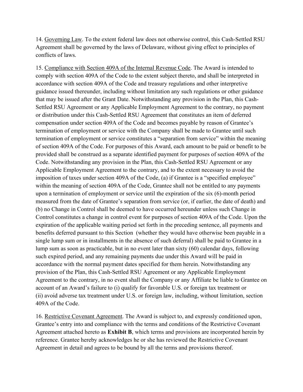14. Governing Law. To the extent federal law does not otherwise control, this Cash-Settled RSU Agreement shall be governed by the laws of Delaware, without giving effect to principles of conflicts of laws. 15. Compliance with Section 409A of the Internal Revenue Code. The Award is intended to comply with section 409A of the Code to the extent subject thereto, and shall be interpreted in accordance with section 409A of the Code and treasury regulations and other interpretive guidance issued thereunder, including without limitation any such regulations or other guidance that may be issued after the Grant Date. Notwithstanding any provision in the Plan, this Cash- Settled RSU Agreement or any Applicable Employment Agreement to the contrary, no payment or distribution under this Cash-Settled RSU Agreement that constitutes an item of deferred compensation under section 409A of the Code and becomes payable by reason of Grantee’s termination of employment or service with the Company shall be made to Grantee until such termination of employment or service constitutes a “separation from service” within the meaning of section 409A of the Code. For purposes of this Award, each amount to be paid or benefit to be provided shall be construed as a separate identified payment for purposes of section 409A of the Code. Notwithstanding any provision in the Plan, this Cash-Settled RSU Agreement or any Applicable Employment Agreement to the contrary, and to the extent necessary to avoid the imposition of taxes under section 409A of the Code, (a) if Grantee is a “specified employee” within the meaning of section 409A of the Code, Grantee shall not be entitled to any payments upon a termination of employment or service until the expiration of the six (6)-month period measured from the date of Grantee’s separation from service (or, if earlier, the date of death) and (b) no Change in Control shall be deemed to have occurred hereunder unless such Change in Control constitutes a change in control event for purposes of section 409A of the Code. Upon the expiration of the applicable waiting period set forth in the preceding sentence, all payments and benefits deferred pursuant to this Section (whether they would have otherwise been payable in a single lump sum or in installments in the absence of such deferral) shall be paid to Grantee in a lump sum as soon as practicable, but in no event later than sixty (60) calendar days, following such expired period, and any remaining payments due under this Award will be paid in accordance with the normal payment dates specified for them herein. Notwithstanding any provision of the Plan, this Cash-Settled RSU Agreement or any Applicable Employment Agreement to the contrary, in no event shall the Company or any Affiliate be liable to Grantee on account of an Award’s failure to (i) qualify for favorable U.S. or foreign tax treatment or (ii) avoid adverse tax treatment under U.S. or foreign law, including, without limitation, section 409A of the Code. 16. Restrictive Covenant Agreement. The Award is subject to, and expressly conditioned upon, Grantee’s entry into and compliance with the terms and conditions of the Restrictive Covenant Agreement attached hereto as Exhibit B, which terms and provisions are incorporated herein by reference. Grantee hereby acknowledges he or she has reviewed the Restrictive Covenant Agreement in detail and agrees to be bound by all the terms and provisions thereof.