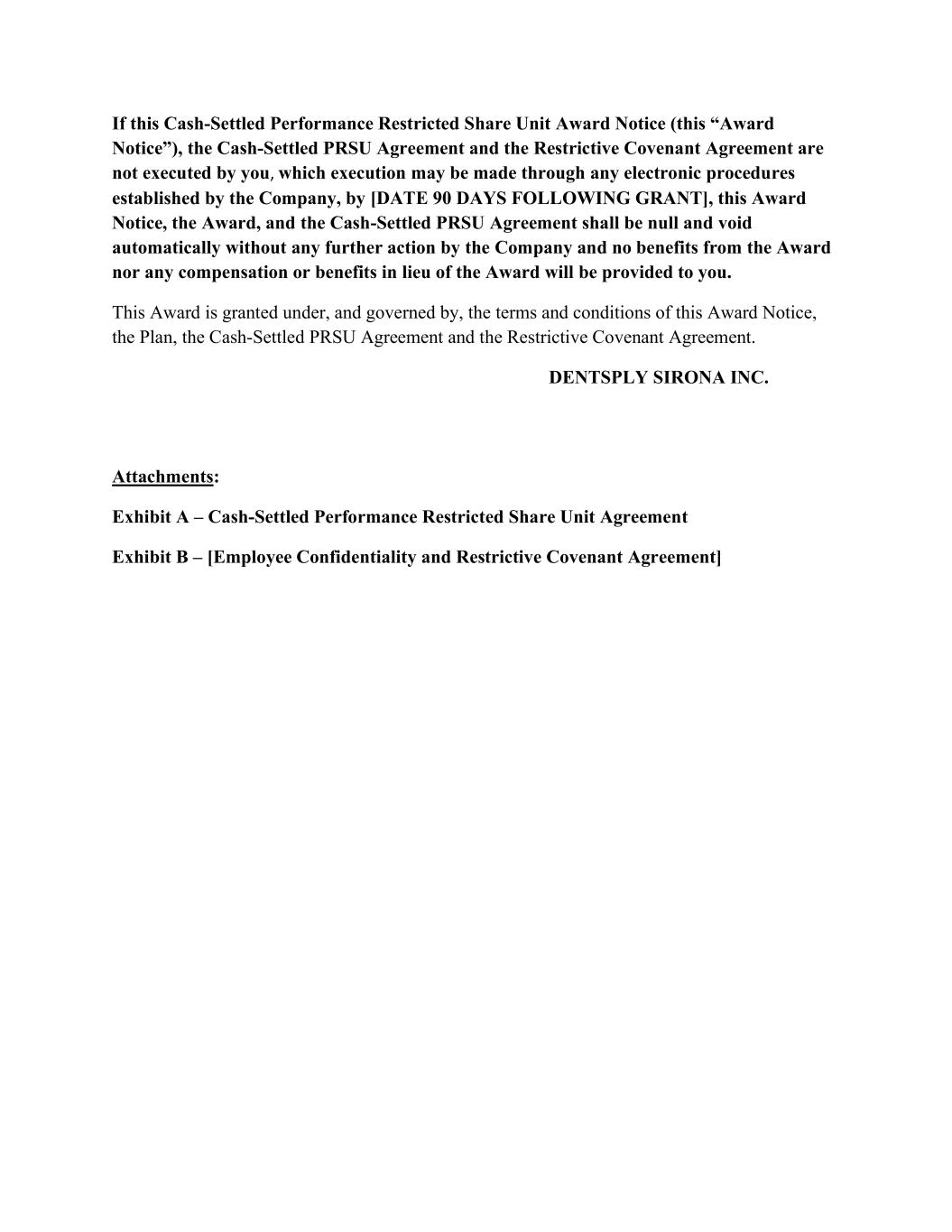 If this Cash-Settled Performance Restricted Share Unit Award Notice (this “Award Notice”), the Cash-Settled PRSU Agreement and the Restrictive Covenant Agreement are not executed by you, which execution may be made through any electronic procedures established by the Company, by [DATE 90 DAYS FOLLOWING GRANT], this Award Notice, the Award, and the Cash-Settled PRSU Agreement shall be null and void automatically without any further action by the Company and no benefits from the Award nor any compensation or benefits in lieu of the Award will be provided to you. This Award is granted under, and governed by, the terms and conditions of this Award Notice, the Plan, the Cash-Settled PRSU Agreement and the Restrictive Covenant Agreement. DENTSPLY SIRONA INC. Attachments: Exhibit A – Cash-Settled Performance Restricted Share Unit Agreement Exhibit B – [Employee Confidentiality and Restrictive Covenant Agreement]