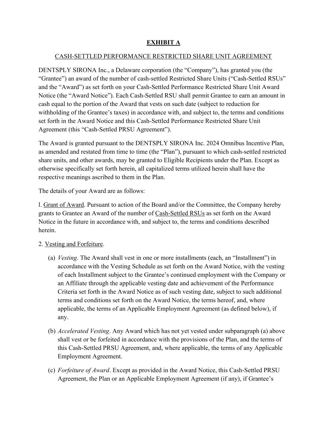 EXHIBIT A CASH-SETTLED PERFORMANCE RESTRICTED SHARE UNIT AGREEMENT DENTSPLY SIRONA Inc., a Delaware corporation (the “Company”), has granted you (the “Grantee”) an award of the number of cash-settled Restricted Share Units (“Cash-Settled RSUs” and the “Award”) as set forth on your Cash-Settled Performance Restricted Share Unit Award Notice (the “Award Notice”). Each Cash-Settled RSU shall permit Grantee to earn an amount in cash equal to the portion of the Award that vests on such date (subject to reduction for withholding of the Grantee’s taxes) in accordance with, and subject to, the terms and conditions set forth in the Award Notice and this Cash-Settled Performance Restricted Share Unit Agreement (this “Cash-Settled PRSU Agreement”). The Award is granted pursuant to the DENTSPLY SIRONA Inc. 2024 Omnibus Incentive Plan, as amended and restated from time to time (the “Plan”), pursuant to which cash-settled restricted share units, and other awards, may be granted to Eligible Recipients under the Plan. Except as otherwise specifically set forth herein, all capitalized terms utilized herein shall have the respective meanings ascribed to them in the Plan. The details of your Award are as follows: l. Grant of Award. Pursuant to action of the Board and/or the Committee, the Company hereby grants to Grantee an Award of the number of Cash-Settled RSUs as set forth on the Award Notice in the future in accordance with, and subject to, the terms and conditions described herein. 2. Vesting and Forfeiture. (a) Vesting. The Award shall vest in one or more installments (each, an “Installment”) in accordance with the Vesting Schedule as set forth on the Award Notice, with the vesting of each Installment subject to the Grantee’s continued employment with the Company or an Affiliate through the applicable vesting date and achievement of the Performance Criteria set forth in the Award Notice as of such vesting date, subject to such additional terms and conditions set forth on the Award Notice, the terms hereof, and, where applicable, the terms of an Applicable Employment Agreement (as defined below), if any. (b) Accelerated Vesting. Any Award which has not yet vested under subparagraph (a) above shall vest or be forfeited in accordance with the provisions of the Plan, and the terms of this Cash-Settled PRSU Agreement, and, where applicable, the terms of any Applicable Employment Agreement. (c) Forfeiture of Award. Except as provided in the Award Notice, this Cash-Settled PRSU Agreement, the Plan or an Applicable Employment Agreement (if any), if Grantee’s