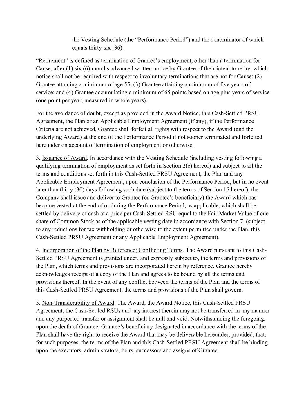 the Vesting Schedule (the “Performance Period”) and the denominator of which equals thirty-six (36). “Retirement” is defined as termination of Grantee’s employment, other than a termination for Cause, after (1) six (6) months advanced written notice by Grantee of their intent to retire, which notice shall not be required with respect to involuntary terminations that are not for Cause; (2) Grantee attaining a minimum of age 55; (3) Grantee attaining a minimum of five years of service; and (4) Grantee accumulating a minimum of 65 points based on age plus years of service (one point per year, measured in whole years). For the avoidance of doubt, except as provided in the Award Notice, this Cash-Settled PRSU Agreement, the Plan or an Applicable Employment Agreement (if any), if the Performance Criteria are not achieved, Grantee shall forfeit all rights with respect to the Award (and the underlying Award) at the end of the Performance Period if not sooner terminated and forfeited hereunder on account of termination of employment or otherwise. 3. Issuance of Award. In accordance with the Vesting Schedule (including vesting following a qualifying termination of employment as set forth in Section 2(c) hereof) and subject to all the terms and conditions set forth in this Cash-Settled PRSU Agreement, the Plan and any Applicable Employment Agreement, upon conclusion of the Performance Period, but in no event later than thirty (30) days following such date (subject to the terms of Section 15 hereof), the Company shall issue and deliver to Grantee (or Grantee’s beneficiary) the Award which has become vested at the end of or during the Performance Period, as applicable, which shall be settled by delivery of cash at a price per Cash-Settled RSU equal to the Fair Market Value of one share of Common Stock as of the applicable vesting date in accordance with Section 7 (subject to any reductions for tax withholding or otherwise to the extent permitted under the Plan, this Cash-Settled PRSU Agreement or any Applicable Employment Agreement). 4. Incorporation of the Plan by Reference; Conflicting Terms. The Award pursuant to this Cash- Settled PRSU Agreement is granted under, and expressly subject to, the terms and provisions of the Plan, which terms and provisions are incorporated herein by reference. Grantee hereby acknowledges receipt of a copy of the Plan and agrees to be bound by all the terms and provisions thereof. In the event of any conflict between the terms of the Plan and the terms of this Cash-Settled PRSU Agreement, the terms and provisions of the Plan shall govern. 5. Non-Transferability of Award. The Award, the Award Notice, this Cash-Settled PRSU Agreement, the Cash-Settled RSUs and any interest therein may not be transferred in any manner and any purported transfer or assignment shall be null and void. Notwithstanding the foregoing, upon the death of Grantee, Grantee’s beneficiary designated in accordance with the terms of the Plan shall have the right to receive the Award that may be deliverable hereunder, provided, that, for such purposes, the terms of the Plan and this Cash-Settled PRSU Agreement shall be binding upon the executors, administrators, heirs, successors and assigns of Grantee.