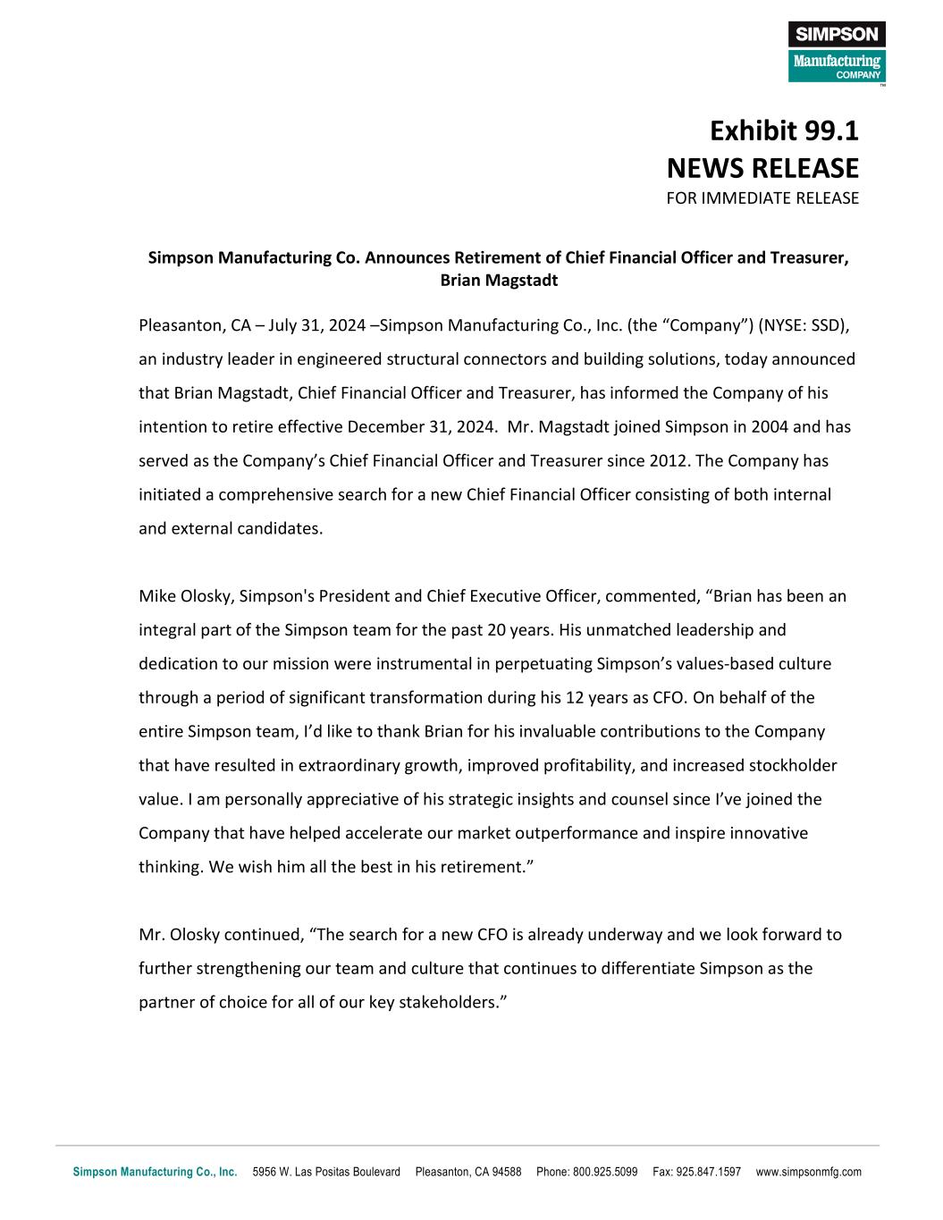 Simpson Manufacturing Co., Inc. 5956 W. Las Positas Boulevard Pleasanton, CA 94588 Phone: 800.925.5099 Fax: 925.847.1597 www.simpsonmfg.com Exhibit 99.1 NEWS RELEASE FOR IMMEDIATE RELEASE Simpson Manufacturing Co. Announces Retirement of Chief Financial Officer and Treasurer, Brian Magstadt Pleasanton, CA – July 31, 2024 –Simpson Manufacturing Co., Inc. (the “Company”) (NYSE: SSD), an industry leader in engineered structural connectors and building solutions, today announced that Brian Magstadt, Chief Financial Officer and Treasurer, has informed the Company of his intention to retire effective December 31, 2024. Mr. Magstadt joined Simpson in 2004 and has served as the Company’s Chief Financial Officer and Treasurer since 2012. The Company has initiated a comprehensive search for a new Chief Financial Officer consisting of both internal and external candidates. Mike Olosky, Simpson's President and Chief Executive Officer, commented, “Brian has been an integral part of the Simpson team for the past 20 years. His unmatched leadership and dedication to our mission were instrumental in perpetuating Simpson’s values-based culture through a period of significant transformation during his 12 years as CFO. On behalf of the entire Simpson team, I’d like to thank Brian for his invaluable contributions to the Company that have resulted in extraordinary growth, improved profitability, and increased stockholder value. I am personally appreciative of his strategic insights and counsel since I’ve joined the Company that have helped accelerate our market outperformance and inspire innovative thinking. We wish him all the best in his retirement.” Mr. Olosky continued, “The search for a new CFO is already underway and we look forward to further strengthening our team and culture that continues to differentiate Simpson as the partner of choice for all of our key stakeholders.”