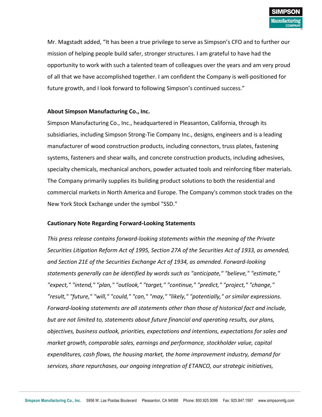 Simpson Manufacturing Co., Inc. 5956 W. Las Positas Boulevard Pleasanton, CA 94588 Phone: 800.925.5099 Fax: 925.847.1597 www.simpsonmfg.com Mr. Magstadt added, “It has been a true privilege to serve as Simpson’s CFO and to further our mission of helping people build safer, stronger structures. I am grateful to have had the opportunity to work with such a talented team of colleagues over the years and am very proud of all that we have accomplished together. I am confident the Company is well-positioned for future growth, and I look forward to following Simpson’s continued success.” About Simpson Manufacturing Co., Inc. Simpson Manufacturing Co., Inc., headquartered in Pleasanton, California, through its subsidiaries, including Simpson Strong-Tie Company Inc., designs, engineers and is a leading manufacturer of wood construction products, including connectors, truss plates, fastening systems, fasteners and shear walls, and concrete construction products, including adhesives, specialty chemicals, mechanical anchors, powder actuated tools and reinforcing fiber materials. The Company primarily supplies its building product solutions to both the residential and commercial markets in North America and Europe. The Company's common stock trades on the New York Stock Exchange under the symbol "SSD." Cautionary Note Regarding Forward-Looking Statements This press release contains forward-looking statements within the meaning of the Private Securities Litigation Reform Act of 1995, Section 27A of the Securities Act of 1933, as amended, and Section 21E of the Securities Exchange Act of 1934, as amended. Forward-looking statements generally can be identified by words such as "anticipate," "believe," "estimate," "expect," "intend," "plan," "outlook," "target," "continue," "predict," "project," "change," "result," "future," "will," "could," "can," "may," "likely," "potentially," or similar expressions. Forward-looking statements are all statements other than those of historical fact and include, but are not limited to, statements about future financial and operating results, our plans, objectives, business outlook, priorities, expectations and intentions, expectations for sales and market growth, comparable sales, earnings and performance, stockholder value, capital expenditures, cash flows, the housing market, the home improvement industry, demand for services, share repurchases, our ongoing integration of ETANCO, our strategic initiatives,