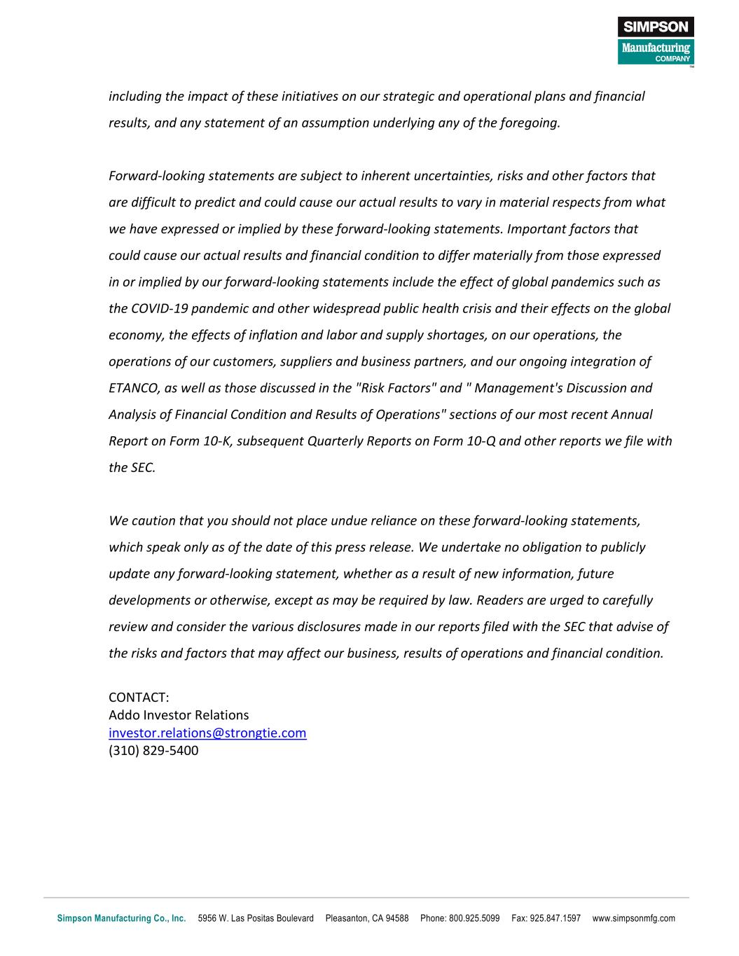 Simpson Manufacturing Co., Inc. 5956 W. Las Positas Boulevard Pleasanton, CA 94588 Phone: 800.925.5099 Fax: 925.847.1597 www.simpsonmfg.com including the impact of these initiatives on our strategic and operational plans and financial results, and any statement of an assumption underlying any of the foregoing. Forward-looking statements are subject to inherent uncertainties, risks and other factors that are difficult to predict and could cause our actual results to vary in material respects from what we have expressed or implied by these forward-looking statements. Important factors that could cause our actual results and financial condition to differ materially from those expressed in or implied by our forward-looking statements include the effect of global pandemics such as the COVID-19 pandemic and other widespread public health crisis and their effects on the global economy, the effects of inflation and labor and supply shortages, on our operations, the operations of our customers, suppliers and business partners, and our ongoing integration of ETANCO, as well as those discussed in the "Risk Factors" and " Management's Discussion and Analysis of Financial Condition and Results of Operations" sections of our most recent Annual Report on Form 10-K, subsequent Quarterly Reports on Form 10-Q and other reports we file with the SEC. We caution that you should not place undue reliance on these forward-looking statements, which speak only as of the date of this press release. We undertake no obligation to publicly update any forward-looking statement, whether as a result of new information, future developments or otherwise, except as may be required by law. Readers are urged to carefully review and consider the various disclosures made in our reports filed with the SEC that advise of the risks and factors that may affect our business, results of operations and financial condition. CONTACT: Addo Investor Relations investor.relations@strongtie.com (310) 829-5400