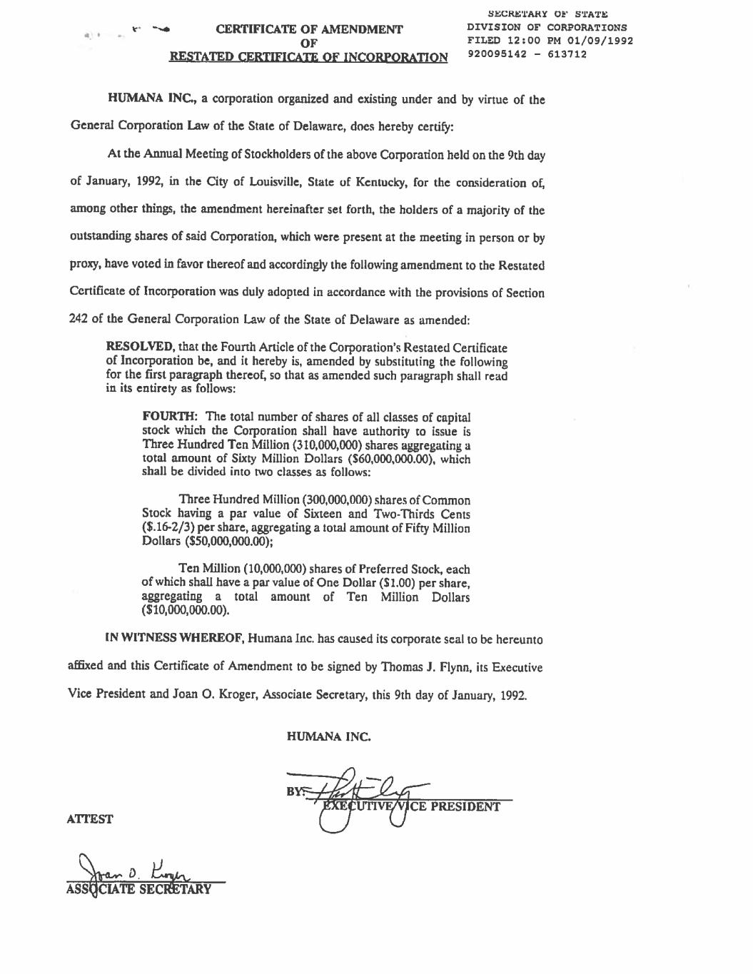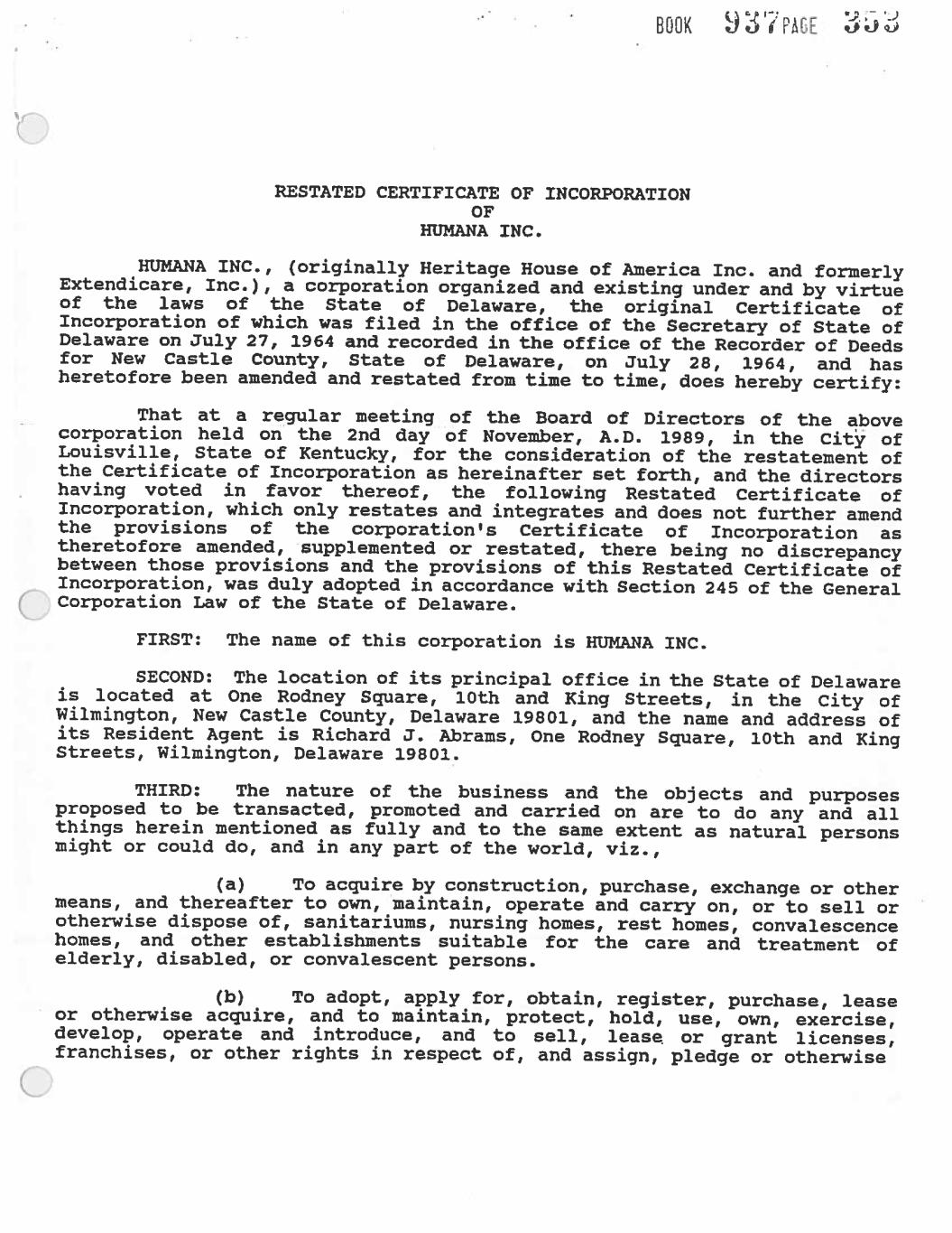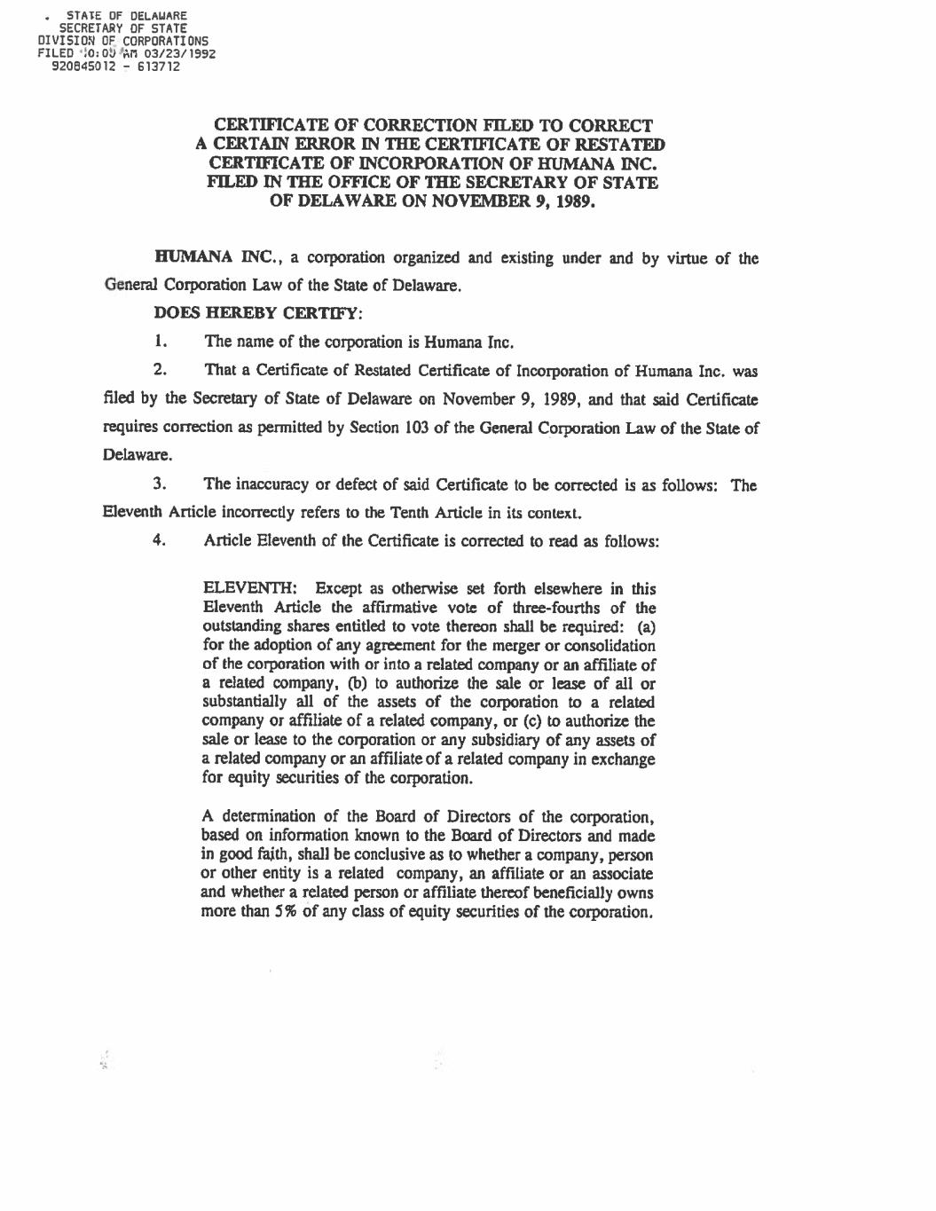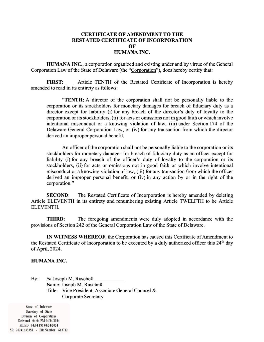 | Restated Certificate of Incorporation of Humana Inc. filed with the Secretary of State of Delaware on November 9, 1989, as restated to incorporate the amendment of January 9, 1992, the correction of March 23, 1992, and the amendment dated April 24, 2024. |