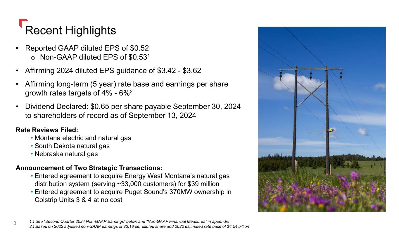 Recent Highlights • Reported GAAP diluted EPS of $0.52 o Non-GAAP diluted EPS of $0.531 • Affirming 2024 diluted EPS guidance of $3.42 - $3.62 • Affirming long-term (5 year) rate base and earnings per share growth rates targets of 4% - 6%2 • Dividend Declared: $0.65 per share payable September 30, 2024 to shareholders of record as of September 13, 2024 Rate Reviews Filed: • Montana electric and natural gas • South Dakota natural gas • Nebraska natural gas Announcement of Two Strategic Transactions: • Entered agreement to acquire Energy West Montana’s natural gas distribution system (serving ~33,000 customers) for $39 million • Entered agreement to acquire Puget Sound’s 370MW ownership in Colstrip Units 3 & 4 at no cost 1.) See “Second Quarter 2024 Non-GAAP Earnings” below and “Non-GAAP Financial Measures” in appendix 2.) Based on 2022 adjusted non-GAAP earnings of $3.18 per diluted share and 2022 estimated rate base of $4.54 billion 3