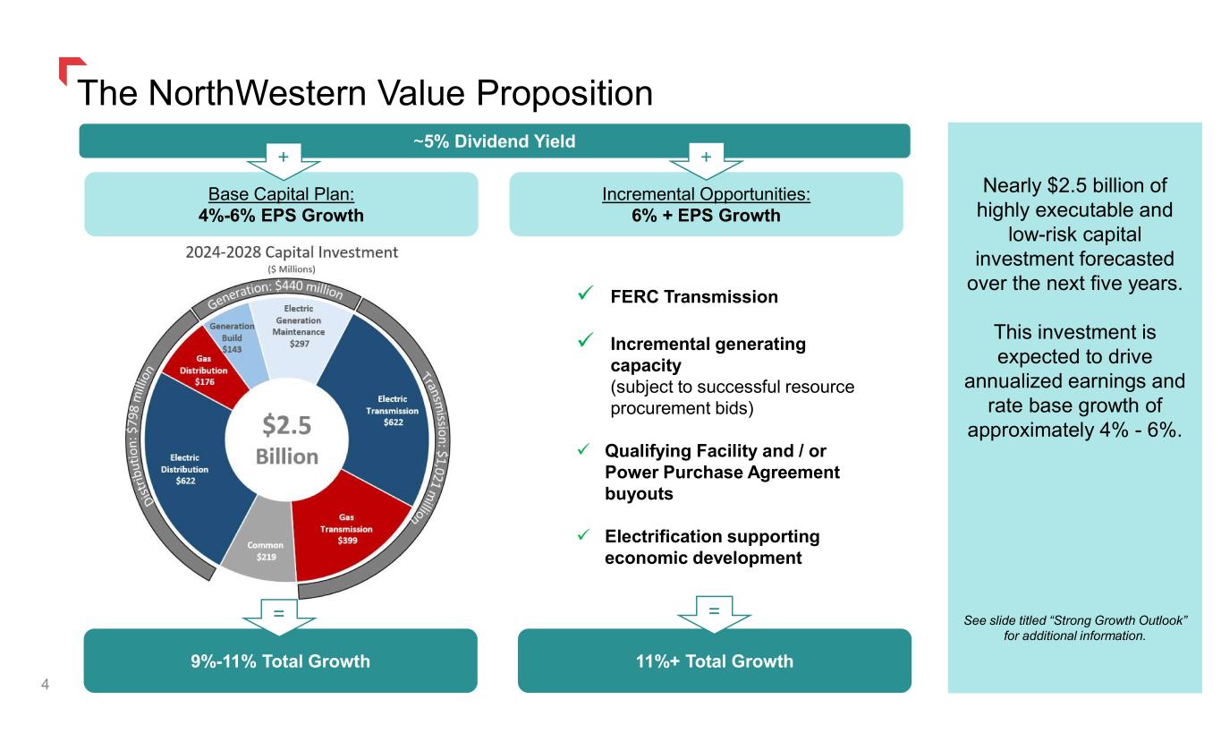 9%-11% Total Growth 11%+ Total Growth Incremental Opportunities: 6% + EPS Growth ~5% Dividend Yield Base Capital Plan: 4%-6% EPS Growth FERC Transmission Incremental generating capacity (subject to successful resource procurement bids) Qualifying Facility and / or Power Purchase Agreement buyouts Electrification supporting economic development Nearly $2.5 billion of highly executable and low-risk capital investment forecasted over the next five years. This investment is expected to drive annualized earnings and rate base growth of approximately 4% - 6%. See slide titled “Strong Growth Outlook” for additional information. + The NorthWestern Value Proposition + 4 = =