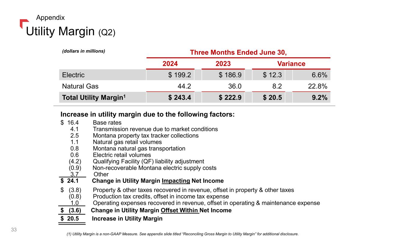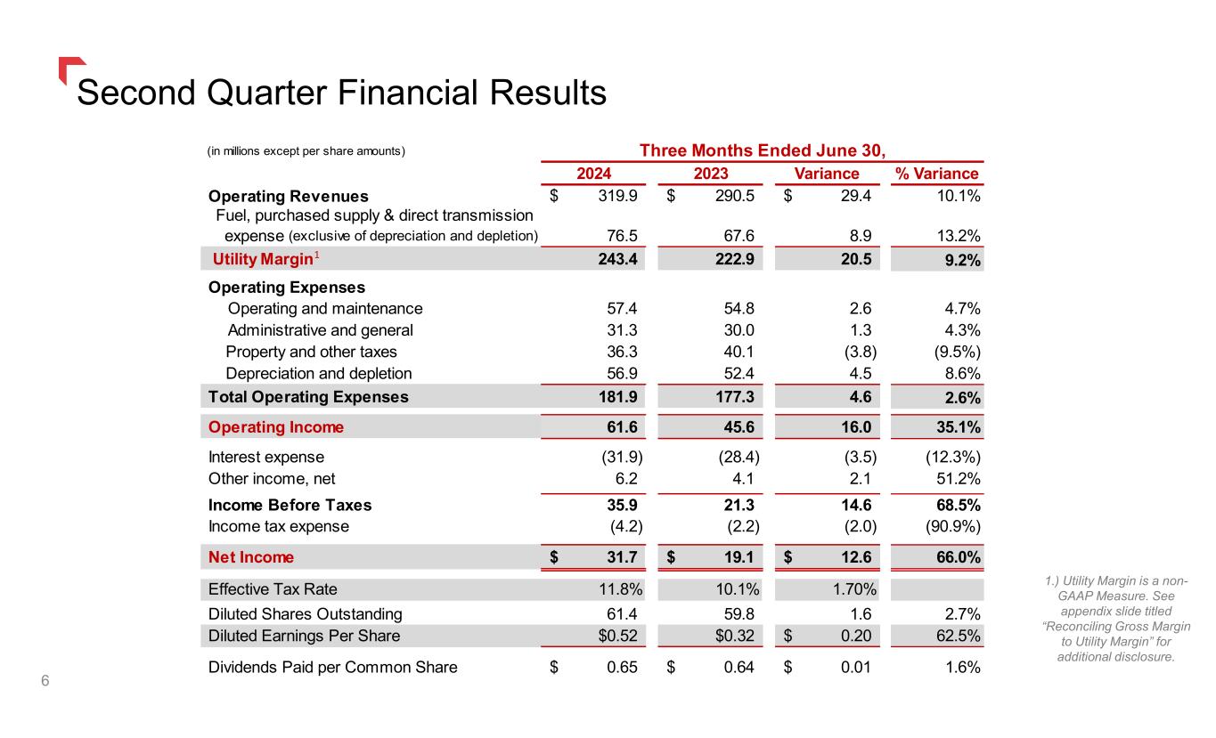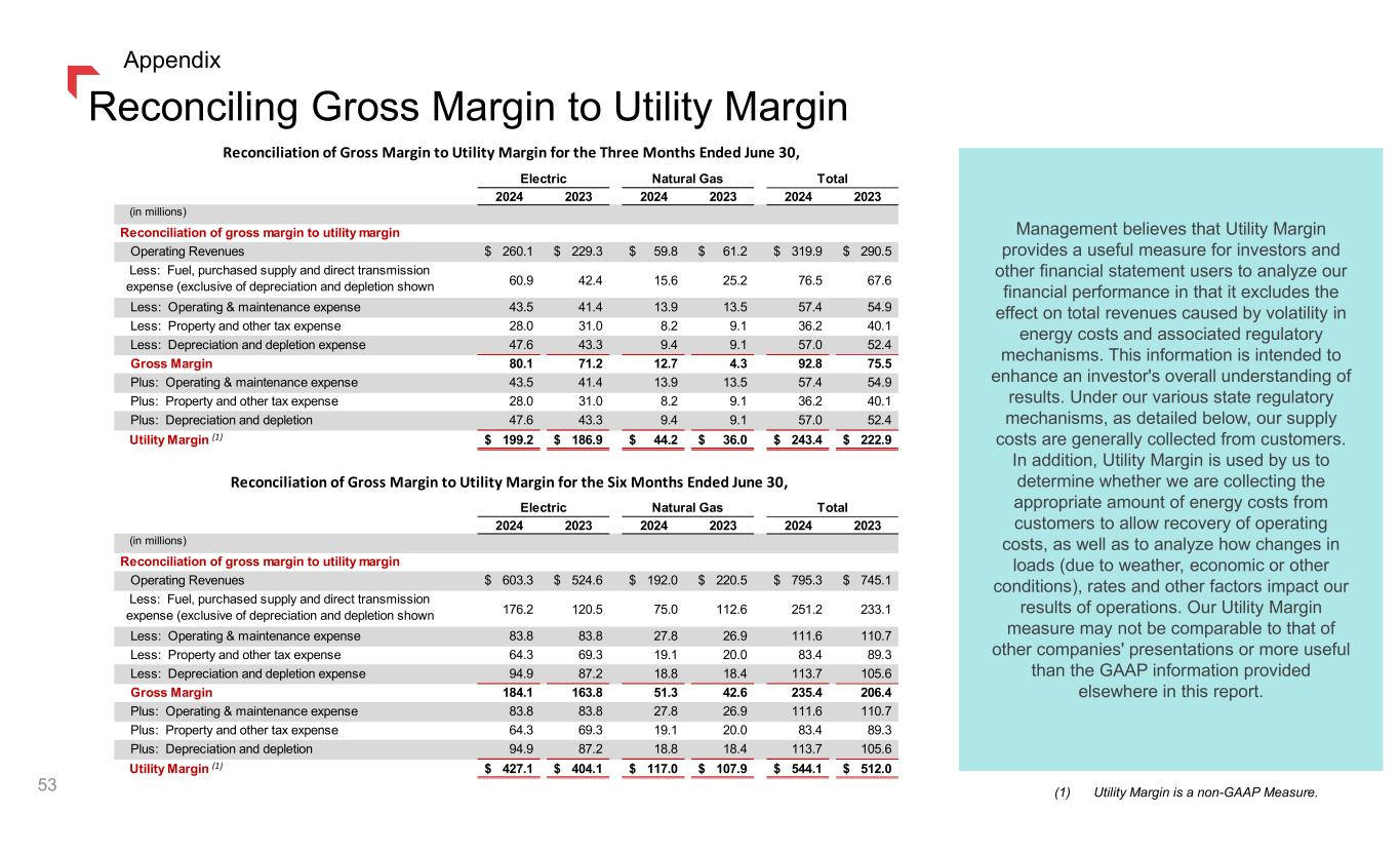Reconciling Gross Margin to Utility Margin Management believes that Utility Margin provides a useful measure for investors and other financial statement users to analyze our financial performance in that it excludes the effect on total revenues caused by volatility in energy costs and associated regulatory mechanisms. This information is intended to enhance an investor's overall understanding of results. Under our various state regulatory mechanisms, as detailed below, our supply costs are generally collected from customers. In addition, Utility Margin is used by us to determine whether we are collecting the appropriate amount of energy costs from customers to allow recovery of operating costs, as well as to analyze how changes in loads (due to weather, economic or other conditions), rates and other factors impact our results of operations. Our Utility Margin measure may not be comparable to that of other companies' presentations or more useful than the GAAP information provided elsewhere in this report. (1) Utility Margin is a non-GAAP Measure. 53 Appendix 2024 2023 2024 2023 2024 2023 (in millions) Reconciliation of gross margin to utility margin Operating Revenues 260.1$ 229.3$ 59.8$ 61.2$ 319.9$ 290.5$ Less: Fuel, purchased supply and direct transmission expense (exclusive of depreciation and depletion shown separately below) 60.9 42.4 15.6 25.2 76.5 67.6 Less: Operating & maintenance expense 43.5 41.4 13.9 13.5 57.4 54.9 Less: Property and other tax expense 28.0 31.0 8.2 9.1 36.2 40.1 Less: Depreciation and depletion expense 47.6 43.3 9.4 9.1 57.0 52.4 Gross Margin 80.1 71.2 12.7 4.3 92.8 75.5 Plus: Operating & maintenance expense 43.5 41.4 13.9 13.5 57.4 54.9 Plus: Property and other tax expense 28.0 31.0 8.2 9.1 36.2 40.1 Plus: Depreciation and depletion 47.6 43.3 9.4 9.1 57.0 52.4 Utility Margin 199.2$ 186.9$ 44.2$ 36.0$ 243.4$ 222.9$ 2024 2023 2024 2023 2024 2023 (in millions) Reconciliation of gross margin to utility margin Operating Revenues 603.3$ 524.6$ 192.0$ 220.5$ 795.3$ 745.1$ Less: Fuel, purchased supply and direct transmission expense (exclusive of depreciation and depletion shown separately below) 176.2 120.5 75.0 112.6 251.2 233.1 Less: Operating & maintenance expense 83.8 83.8 27.8 26.9 111.6 110.7 Less: Property and other tax expense 64.3 69.3 19.1 20.0 83.4 89.3 Less: Depreciation and depletion expense 94.9 87.2 18.8 18.4 113.7 105.6 Gross Margin 184.1 163.8 51.3 42.6 235.4 206.4 Plus: Operating & maintenance expense 83.8 83.8 27.8 26.9 111.6 110.7 Plus: Property and other tax expense 64.3 69.3 19.1 20.0 83.4 89.3 Plus: Depreciation and depletion 94.9 87.2 18.8 18.4 113.7 105.6 Utility Margin 427.1$ 404.1$ 117.0$ 107.9$ 544.1$ 512.0$ Total Reconciliation of Gross Margin to Utility Margin for the Three Months Ended June 30, Reconciliation of Gross Margin to Utility Margin for the Six Months Ended June 30, Electric Natural Gas Total Electric Natural Gas (1) (1)