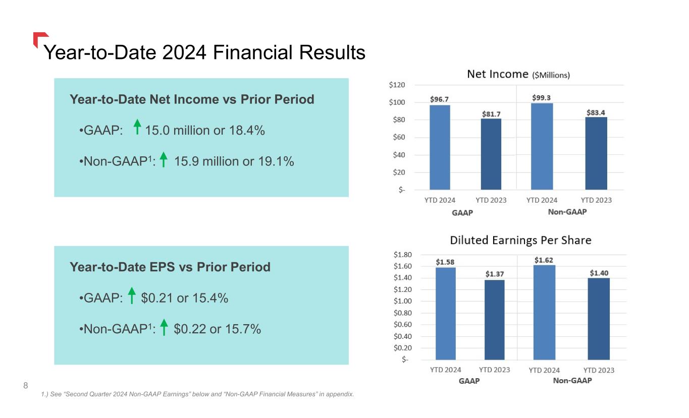 Second Quarter 2024 Financial Results 7 1.) See “Second Quarter 2024 Non-GAAP Earnings” below and “Non-GAAP Financial Measures” in appendix. Second Quarter Net Income vs Prior Period •GAAP: 12.6 million or 66.0% •Non-GAAP1: 11.8 million or 57.8% Second Quarter EPS vs Prior Period •GAAP: $0.20 or 62.5% •Non-GAAP1: $0.18 or 51.4%