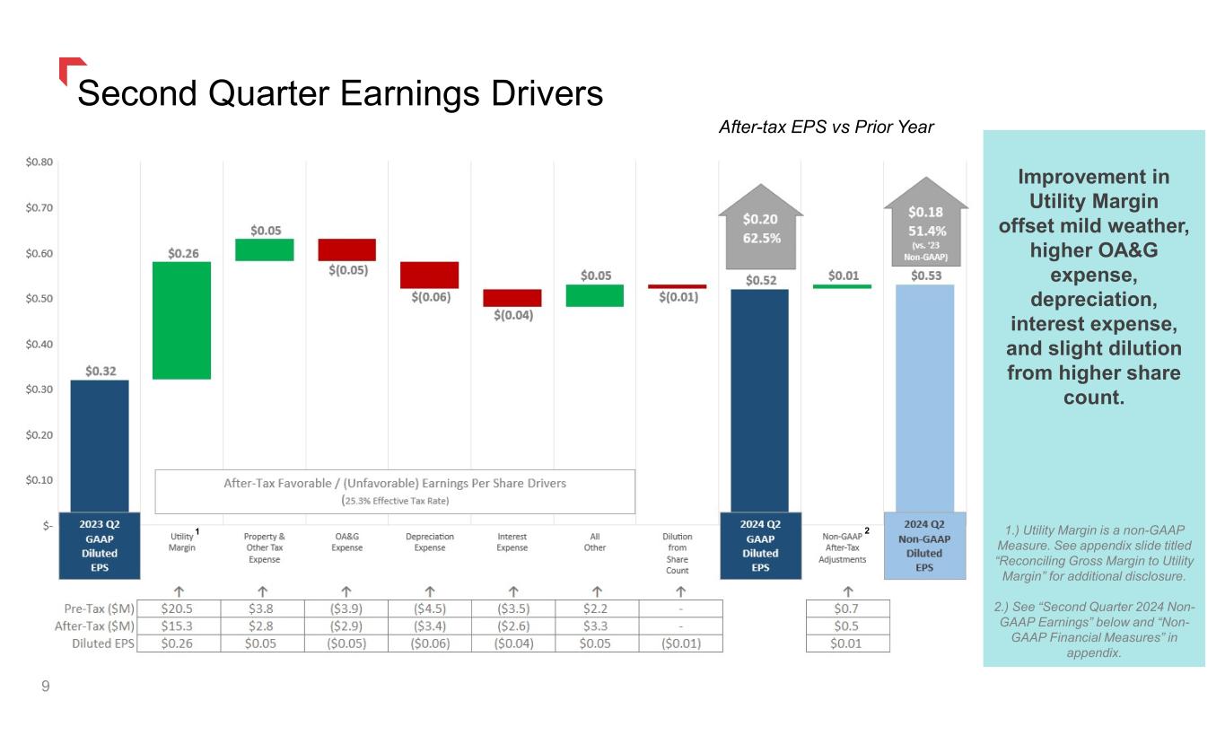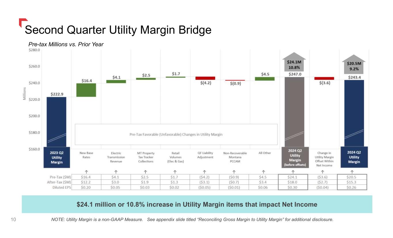 After-tax EPS vs Prior Year Second Quarter Earnings Drivers 9 1 2 Improvement in Utility Margin offset mild weather, higher OA&G expense, depreciation, interest expense, and slight dilution from higher share count. 1.) Utility Margin is a non-GAAP Measure. See appendix slide titled “Reconciling Gross Margin to Utility Margin” for additional disclosure. 2.) See “Second Quarter 2024 Non- GAAP Earnings” below and “Non- GAAP Financial Measures” in appendix.