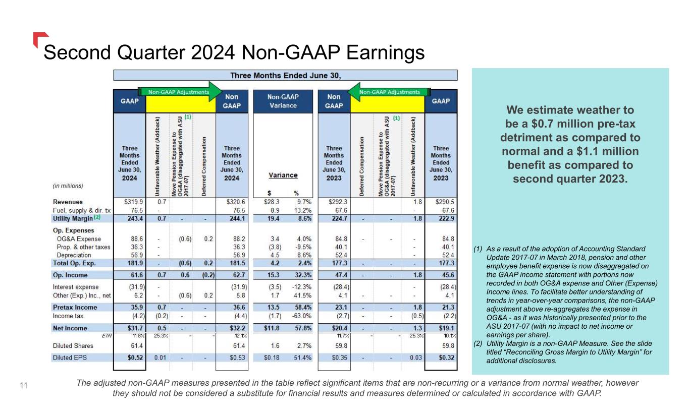 Second Quarter Utility Margin Bridge Pre-tax Millions vs. Prior Year $24.1 million or 10.8% increase in Utility Margin items that impact Net Income NOTE: Utility Margin is a non-GAAP Measure. See appendix slide titled “Reconciling Gross Margin to Utility Margin” for additional disclosure. 10