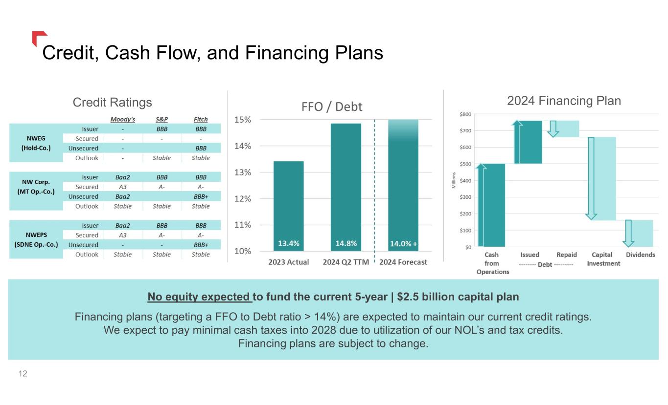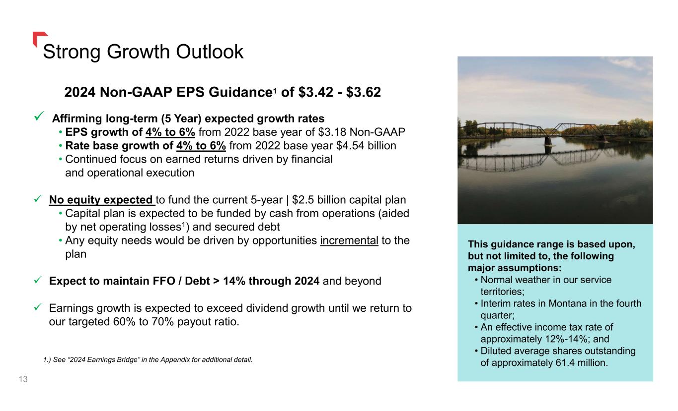 Credit, Cash Flow, and Financing Plans 12 Credit Ratings 2024 Financing Plan No equity expected to fund the current 5-year | $2.5 billion capital plan Financing plans (targeting a FFO to Debt ratio > 14%) are expected to maintain our current credit ratings. We expect to pay minimal cash taxes into 2028 due to utilization of our NOL’s and tax credits. Financing plans are subject to change.