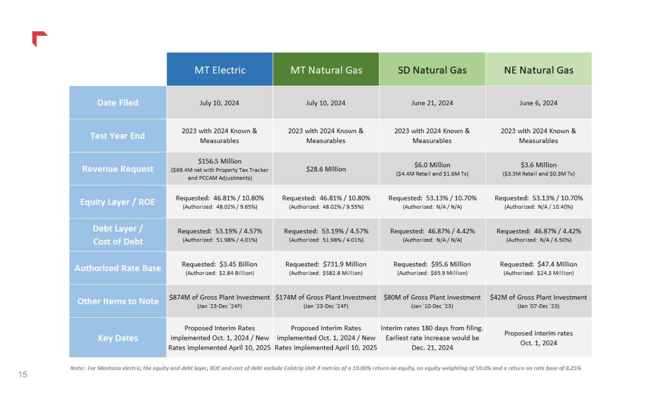 South Dakota Natural Gas Rate Review - On June 21, 2024, we filed a natural gas rate review with the South Dakota Public Utilities Commission. The filing requests a base rate annual revenue increase of $6.0 million. Our request is based on a return on equity of 10.70 percent, a capital structure including 53.13 percent equity, and rate base of $95.6 million. If a final order is not received by December 21, 2024, interim base rates may go into effect.