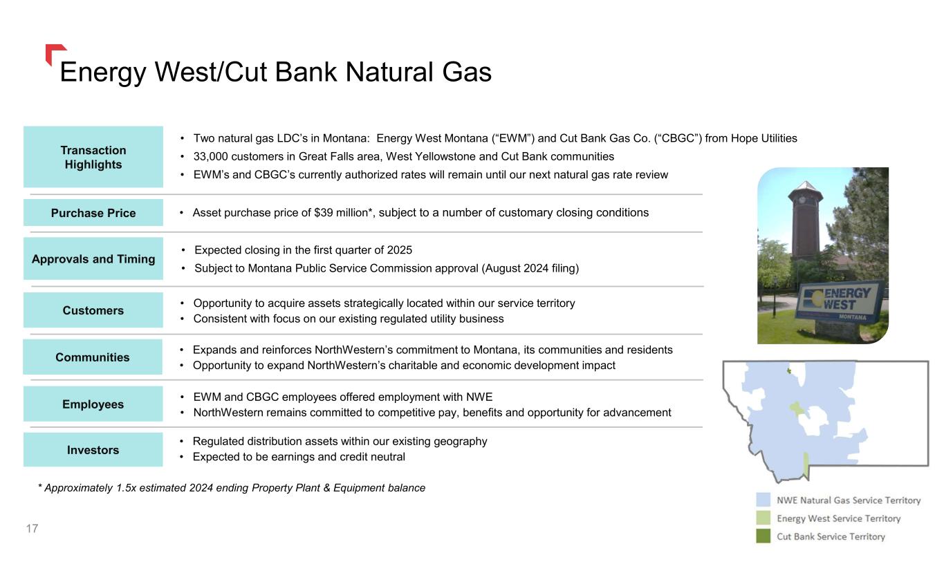 Energy West/Cut Bank Natural Gas 17 Transaction Highlights Purchase Price Approvals and Timing • Two natural gas LDC’s in Montana: Energy West Montana (“EWM”) and Cut Bank Gas Co. (“CBGC”) from Hope Utilities • 33,000 customers in Great Falls area, West Yellowstone and Cut Bank communities • EWM’s and CBGC’s currently authorized rates will remain until our next natural gas rate review • Asset purchase price of $39 million*, subject to a number of customary closing conditions • Expected closing in the first quarter of 2025 • Subject to Montana Public Service Commission approval (August 2024 filing) • Opportunity to acquire assets strategically located within our service territory • Consistent with focus on our existing regulated utility business Customers • Expands and reinforces NorthWestern’s commitment to Montana, its communities and residents • Opportunity to expand NorthWestern’s charitable and economic development impact Communities • EWM and CBGC employees offered employment with NWE • NorthWestern remains committed to competitive pay, benefits and opportunity for advancement Employees • Regulated distribution assets within our existing geography • Expected to be earnings and credit neutral Investors * Approximately 1.5x estimated 2024 ending Property Plant & Equipment balance