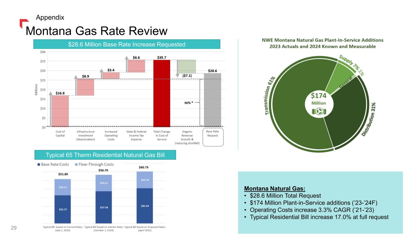 Montana Electric Rate Review Montana Electric: • 69.4 Million Total Request • $874 Million Plant-in-Service additions (’23-’24F) • Operating Costs increase 1.1% CAGR (’21-’23) • Typical Residential Bill increase 8.3% at full request 28 $156.5 Million Base Rate Increase Requested & $69.4 Million Total Request Typical 750 kWh Residential Electric Bill YCGS Net Customer Impact Appendix