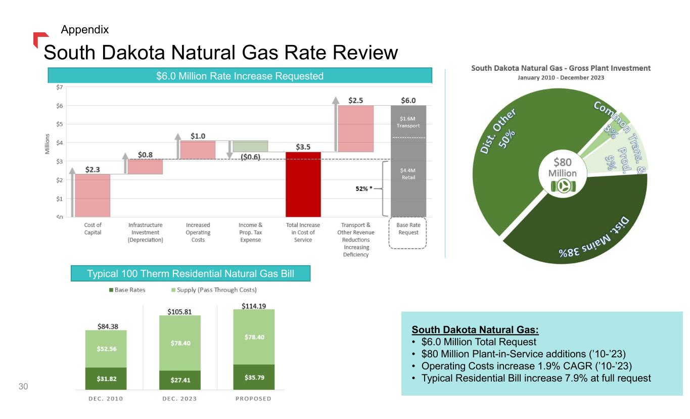 Montana Gas Rate Review 29 $28.6 Million Base Rate Increase Requested Montana Natural Gas: • $28.6 Million Total Request • $174 Million Plant-in-Service additions (’23-’24F) • Operating Costs increase 3.3% CAGR (’21-’23) • Typical Residential Bill increase 17.0% at full request Typical 65 Therm Residential Natural Gas Bill Appendix