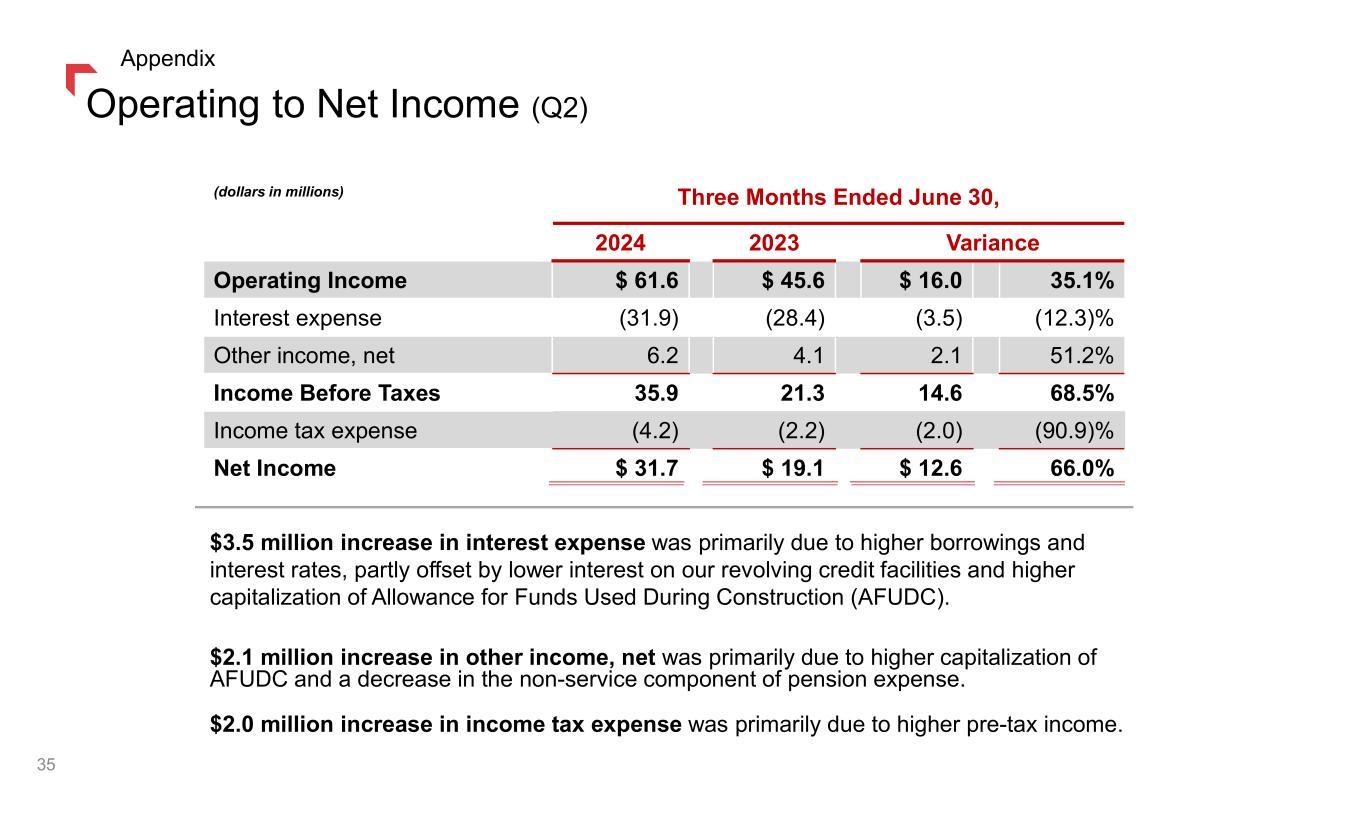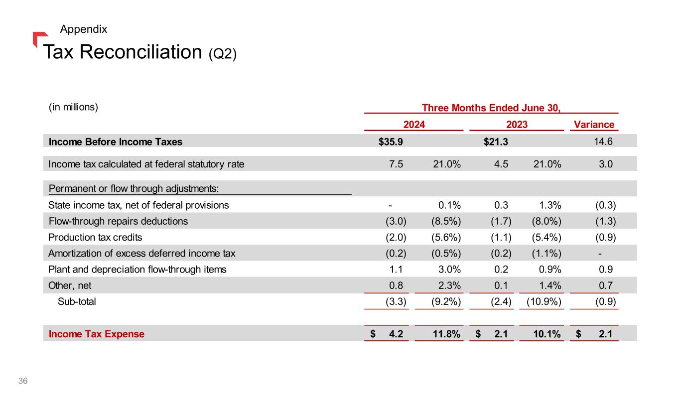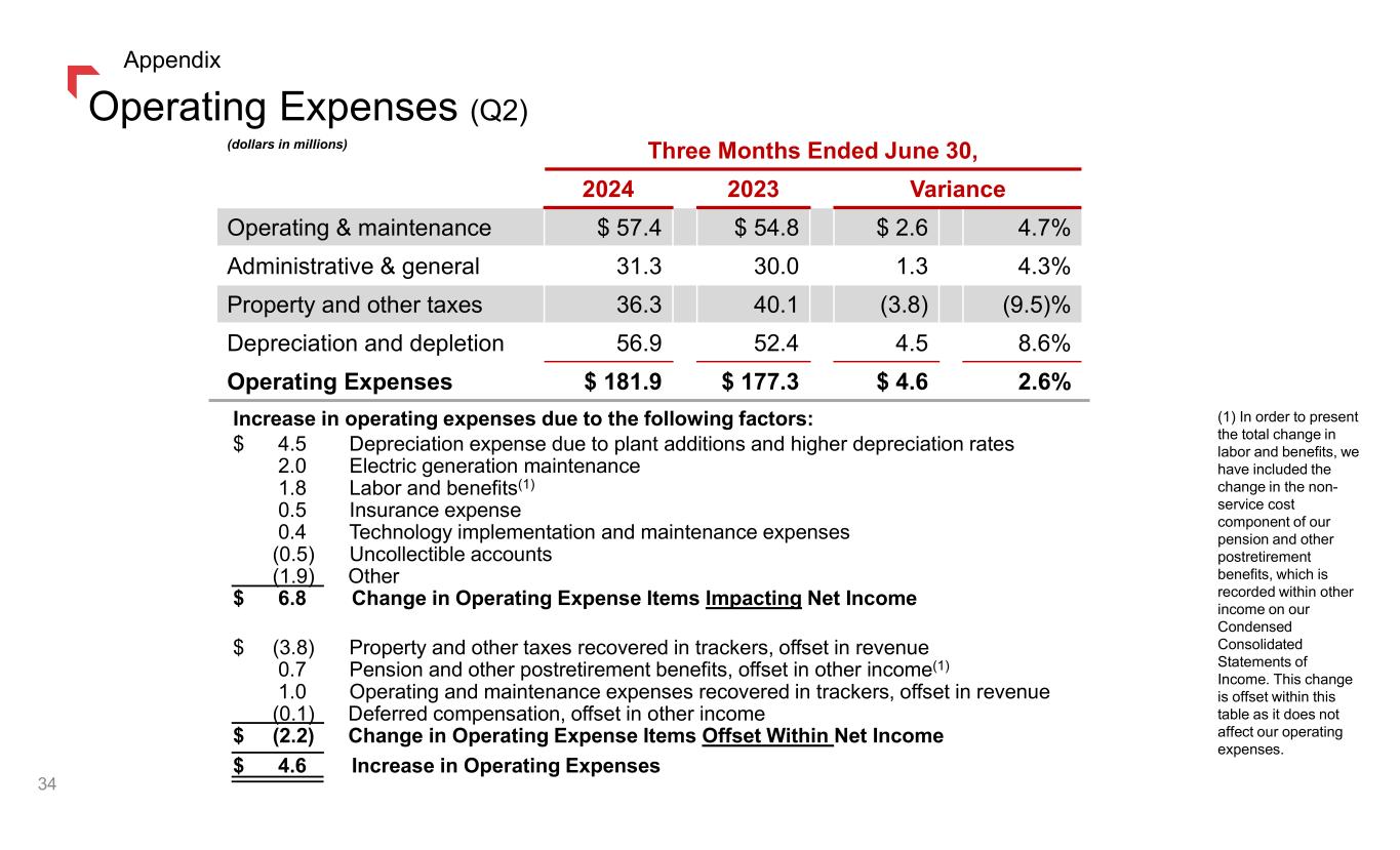 Operating Expenses (Q2) Increase in operating expenses due to the following factors: $ 4.5 Depreciation expense due to plant additions and higher depreciation rates 2.0 Electric generation maintenance 1.8 Labor and benefits(1) 0.5 Insurance expense 0.4 Technology implementation and maintenance expenses (0.5) Uncollectible accounts (1.9) Other $ 6.8 Change in Operating Expense Items Impacting Net Income (dollars in millions) Three Months Ended June 30, 2024 2023 Variance Operating & maintenance $ 57.4 $ 54.8 $ 2.6 4.7% Administrative & general 31.3 30.0 1.3 4.3% Property and other taxes 36.3 40.1 (3.8) (9.5)% Depreciation and depletion 56.9 52.4 4.5 8.6% Operating Expenses $ 181.9 $ 177.3 $ 4.6 2.6% $ (3.8) Property and other taxes recovered in trackers, offset in revenue 0.7 Pension and other postretirement benefits, offset in other income(1) 1.0 Operating and maintenance expenses recovered in trackers, offset in revenue (0.1) Deferred compensation, offset in other income $ (2.2) Change in Operating Expense Items Offset Within Net Income $ 4.6 Increase in Operating Expenses (1) In order to present the total change in labor and benefits, we have included the change in the non- service cost component of our pension and other postretirement benefits, which is recorded within other income on our Condensed Consolidated Statements of Income. This change is offset within this table as it does not affect our operating expenses. 34 Appendix