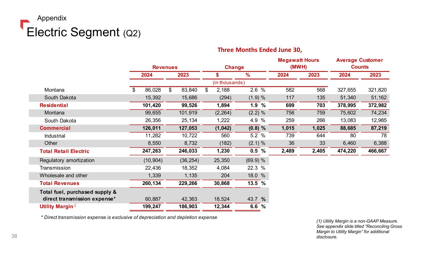 Segment Results (Q2) (1) Utility Margin is a non-GAAP Measure. See appendix slide titled “Reconciling Gross Margin to Utility Margin” for additional disclosure. 37 Appendix Three Months Ended June 30, 2024 Electric Gas Other Total Operating revenues 260,134$ 59,795$ -$ 319,929$ Fuel, purchased supply & direct transmission* 60,887 15,593 - 76,480 Utility margin 199,247 44,202 - 243,449 Operating and maintenance 43,467 13,900 - 57,367 Administrative and general 23,294 7,821 166 31,281 Property and other taxes 28,006 8,251 (1) 36,256 Depreciation & depletion 47,546 9,387 56,933 Operating income (loss) 56,934 4,843 (165) 61,612 Interest expense (23,298) (7,147) (1,430) (31,875) Other income 4,031 927 1,202 6,160 Income tax (expense) benefit (3,891) 304 (656) (4,243) Net income (loss) 33,776$ (1,073)$ (1,049)$ 31,654$ Three Months Ended June 30, 2023 Electric Gas Other Total Operating revenues 229,266$ 61,236$ -$ 290,502$ Fuel, purchased supply & direct transmission* 42,363 25,215 - 67,578 Utility margin 186,903 36,021 - 222,924 Operating and maintenance 41,368 13,472 - 54,840 Administrative and general 21,635 8,321 (1) 29,955 Property and other taxes 31,022 9,104 3 40,129 Depreciation & depletion 43,319 9,061 - 52,380 Operating income (loss) 49,559 (3,937) (2) 45,620 Interest expense (21,724) (4,490) (2,197) (28,411) Other income (expense) 2,954 1,144 (36) 4,062 Income tax (expense) benefit (3,515) (373) 1,741 (2,147) Net income (loss) 27,274$ (7,656)$ (494)$ 19,124$ * Direct Transmission expense excludes depreciation and depletion (in thousands) 1 1