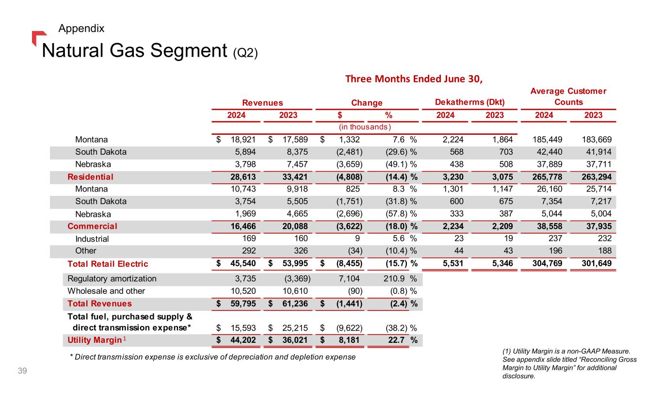 2024 2023 $ % 2024 2023 2024 2023 Montana 86,028$ 83,840$ 2,188$ 2.6 % 582 568 327,655 321,820 South Dakota 15,392 15,686 (294) (1.9) % 117 135 51,340 51,162 Residential 101,420 99,526 1,894 1.9 % 699 703 378,995 372,982 Montana 99,655 101,919 (2,264) (2.2) % 756 759 75,602 74,234 South Dakota 26,356 25,134 1,222 4.9 % 259 266 13,083 12,985 Commercial 126,011 127,053 (1,042) (0.8) % 1,015 1,025 88,685 87,219 Industrial 11,282 10,722 560 5.2 % 739 644 80 78 Other 8,550 8,732 (182) (2.1) % 36 33 6,460 6,388 Total Retail Electric 247,263 246,033 1,230 0.5 % 2,489 2,405 474,220 466,667 Regulatory amortization (10,904) (36,254) 25,350 (69.9) % Transmission 22,436 18,352 4,084 22.3 % Wholesale and other 1,339 1,135 204 18.0 % Total Revenues 260,134 229,266 30,868 13.5 % Total fuel, purchased supply & direct transmission expense* 60,887 42,363 18,524 43.7 % Utility Margin 199,247 186,903 12,344 6.6 % * Direct transmission expense is exclusive of depreciation and depletion expense (in thousands) Megawatt Hours (MWH) Average Customer CountsChange Three Months Ended June 30, Revenues 1 Electric Segment (Q2) (1) Utility Margin is a non-GAAP Measure. See appendix slide titled “Reconciling Gross Margin to Utility Margin” for additional disclosure. 38 Appendix