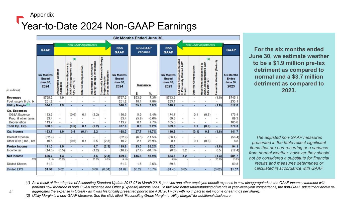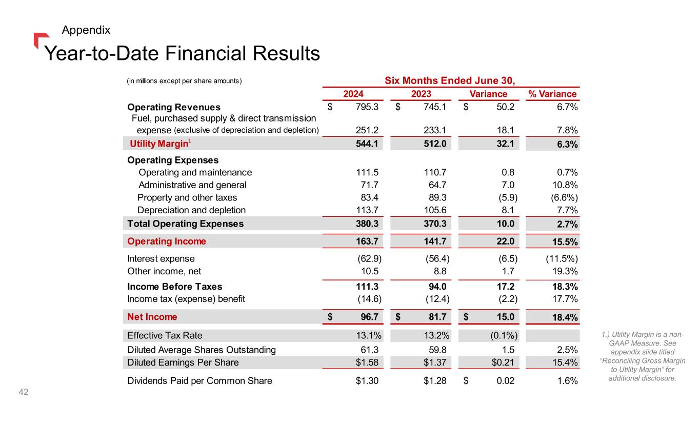 (1) As a result of the adoption of Accounting Standard Update 2017-07 in March 2018, pension and other employee benefit expense is now disaggregated on the GAAP income statement with portions now recorded in both OG&A expense and Other (Expense) Income lines. To facilitate better understanding of trends in year-over-year comparisons, the non-GAAP adjustment above re- aggregates the expense in OG&A - as it was historically presented prior to the ASU 2017-07 (with no impact to net income or earnings per share). (2) Utility Margin is a non-GAAP Measure. See the slide titled “Reconciling Gross Margin to Utility Margin” for additional disclosure. Year-to-Date 2024 Non-GAAP Earnings 41 For the six months ended June 30, we estimate weather to be a $1.9 million pre-tax detriment as compared to normal and a $3.7 million detriment as compared to 2023. The adjusted non-GAAP measures presented in the table reflect significant items that are non-recurring or a variance from normal weather, however they should not be considered a substitute for financial results and measures determined or calculated in accordance with GAAP. Appendix