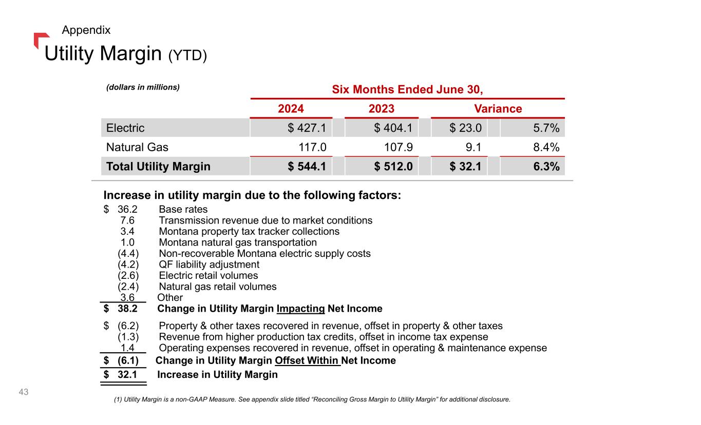 (in millions except per share amounts) 2024 2023 Variance % Variance Operating Revenues 795.3$ 745.1$ 50.2$ 6.7% 251.2 233.1 18.1 7.8% Utility Margin 544.1 512.0 32.1 6.3% Operating Expenses Operating and maintenance 111.5 110.7 0.8 0.7% Administrative and general 71.7 64.7 7.0 10.8% Property and other taxes 83.4 89.3 (5.9) (6.6%) Depreciation and depletion 113.7 105.6 8.1 7.7% Total Operating Expenses 380.3 370.3 10.0 2.7% Operating Income 163.7 141.7 22.0 15.5% Interest expense (62.9) (56.4) (6.5) (11.5%) Other income, net 10.5 8.8 1.7 19.3% Income Before Taxes 111.3 94.0 17.2 18.3% Income tax (expense) benefit (14.6) (12.4) (2.2) 17.7% Net Income 96.7$ 81.7$ 15.0$ 18.4% Effective Tax Rate 13.1% 13.2% (0.1%) Diluted Average Shares Outstanding 61.3 59.8 1.5 2.5% Diluted Earnings Per Share $1.58 $1.37 $0.21 15.4% Dividends Paid per Common Share $1.30 $1.28 0.02$ 1.6% Six Months Ended June 30, Fuel, purchased supply & direct transmission expense (exclusive of depreciation and depletion) 1 Year-to-Date Financial Results 42 1.) Utility Margin is a non- GAAP Measure. See appendix slide titled “Reconciling Gross Margin to Utility Margin” for additional disclosure. Appendix