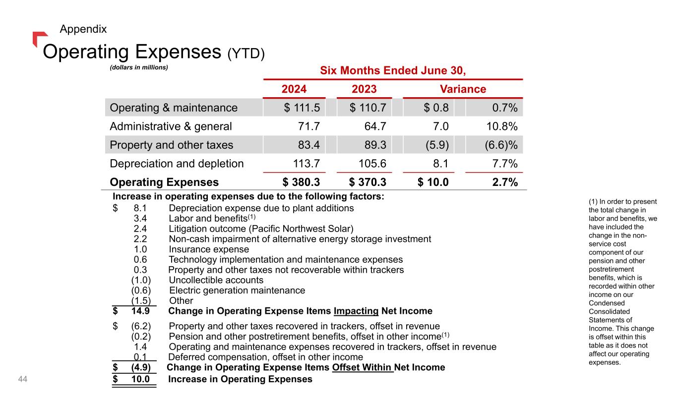 (dollars in millions) Six Months Ended June 30, 2024 2023 Variance Operating & maintenance $ 111.5 $ 110.7 $ 0.8 0.7% Administrative & general 71.7 64.7 7.0 10.8% Property and other taxes 83.4 89.3 (5.9) (6.6)% Depreciation and depletion 113.7 105.6 8.1 7.7% Operating Expenses $ 380.3 $ 370.3 $ 10.0 2.7% Increase in operating expenses due to the following factors: $ 8.1 Depreciation expense due to plant additions 3.4 Labor and benefits(1) 2.4 Litigation outcome (Pacific Northwest Solar) 2.2 Non-cash impairment of alternative energy storage investment 1.0 Insurance expense 0.6 Technology implementation and maintenance expenses 0.3 Property and other taxes not recoverable within trackers (1.0) Uncollectible accounts (0.6) Electric generation maintenance (1.5) Other $ 14.9 Change in Operating Expense Items Impacting Net Income $ (6.2) Property and other taxes recovered in trackers, offset in revenue (0.2) Pension and other postretirement benefits, offset in other income(1) 1.4 Operating and maintenance expenses recovered in trackers, offset in revenue 0.1 Deferred compensation, offset in other income $ (4.9) Change in Operating Expense Items Offset Within Net Income $ 10.0 Increase in Operating Expenses Operating Expenses (YTD) (1) In order to present the total change in labor and benefits, we have included the change in the non- service cost component of our pension and other postretirement benefits, which is recorded within other income on our Condensed Consolidated Statements of Income. This change is offset within this table as it does not affect our operating expenses. 44 Appendix