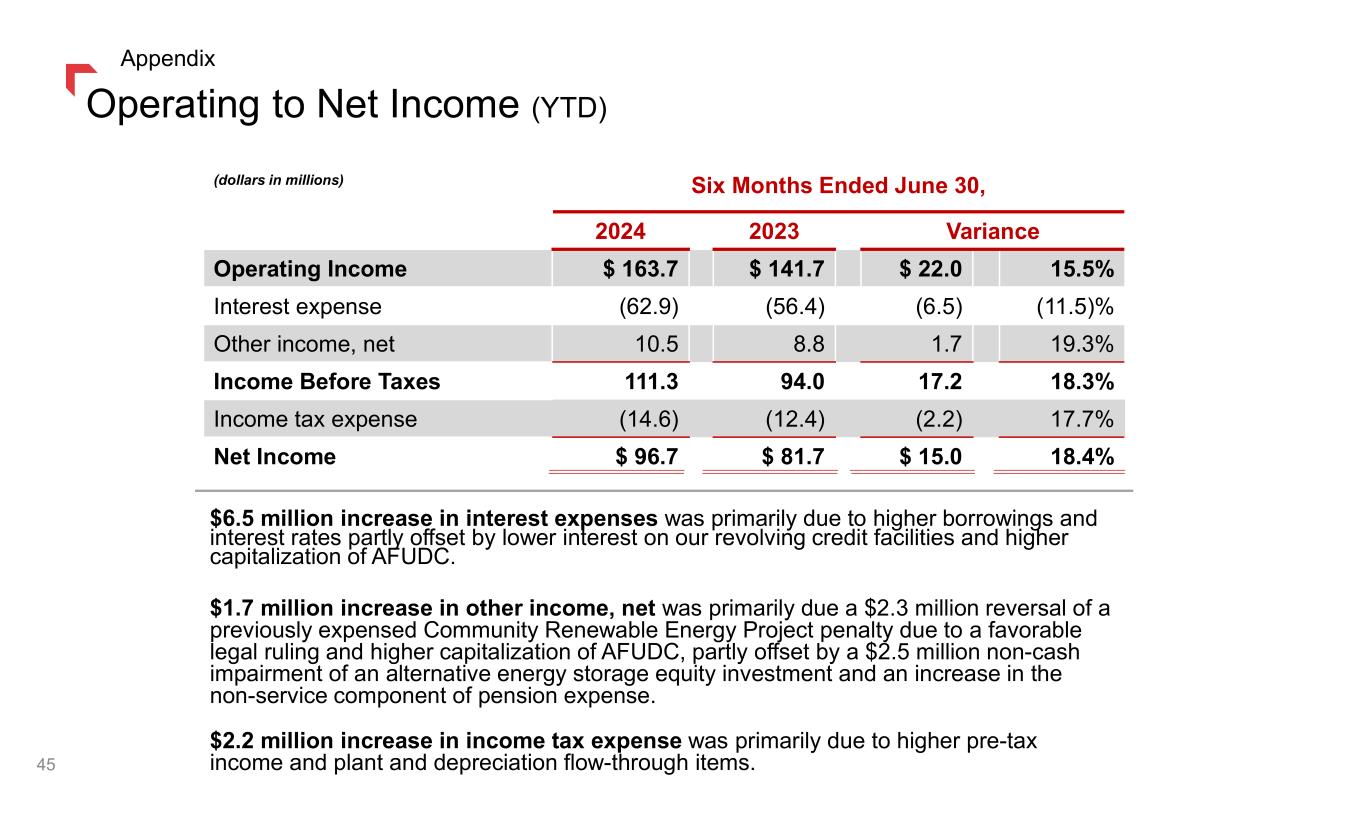 Operating to Net Income (YTD) (dollars in millions) Six Months Ended June 30, 2024 2023 Variance Operating Income $ 163.7 $ 141.7 $ 22.0 15.5% Interest expense (62.9) (56.4) (6.5) (11.5)% Other income, net 10.5 8.8 1.7 19.3% Income Before Taxes 111.3 94.0 17.2 18.3% Income tax expense (14.6) (12.4) (2.2) 17.7% Net Income $ 96.7 $ 81.7 $ 15.0 18.4% $6.5 million increase in interest expenses was primarily due to higher borrowings and interest rates partly offset by lower interest on our revolving credit facilities and higher capitalization of AFUDC. $1.7 million increase in other income, net was primarily due a $2.3 million reversal of a previously expensed Community Renewable Energy Project penalty due to a favorable legal ruling and higher capitalization of AFUDC, partly offset by a $2.5 million non-cash impairment of an alternative energy storage equity investment and an increase in the non-service component of pension expense. $2.2 million increase in income tax expense was primarily due to higher pre-tax income and plant and depreciation flow-through items.45 Appendix