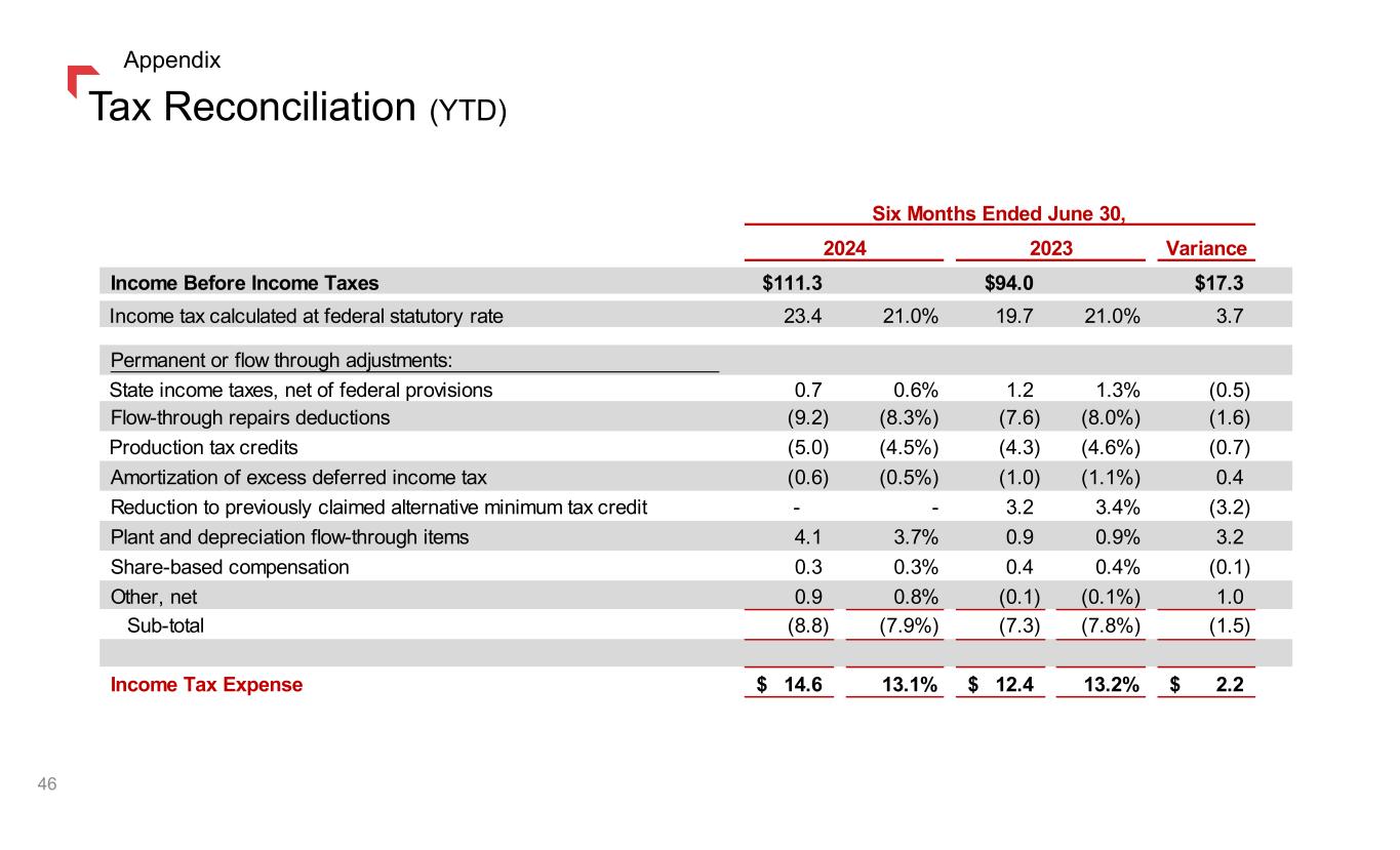 Tax Reconciliation (YTD) 46 Appendix Variance Income Before Income Taxes $111.3 $94.0 $17.3 Income tax calculated at federal statutory rate 23.4 21.0% 19.7 21.0% 3.7 Permanent or flow through adjustments: State income taxes, net of federal provisions 0.7 0.6% 1.2 1.3% (0.5) Flow-through repairs deductions (9.2) (8.3%) (7.6) (8.0%) (1.6) Production tax credits (5.0) (4.5%) (4.3) (4.6%) (0.7) Amortization of excess deferred income tax (0.6) (0.5%) (1.0) (1.1%) 0.4 Reduction to previously claimed alternative minimum tax credit - - 3.2 3.4% (3.2) Plant and depreciation flow-through items 4.1 3.7% 0.9 0.9% 3.2 Share-based compensation 0.3 0.3% 0.4 0.4% (0.1) Other, net 0.9 0.8% (0.1) (0.1%) 1.0 Sub-total (8.8) (7.9%) (7.3) (7.8%) (1.5) Income Tax Expense 14.6$ 13.1% 12.4$ 13.2% 2.2$ 2024 2023 Six Months Ended June 30,