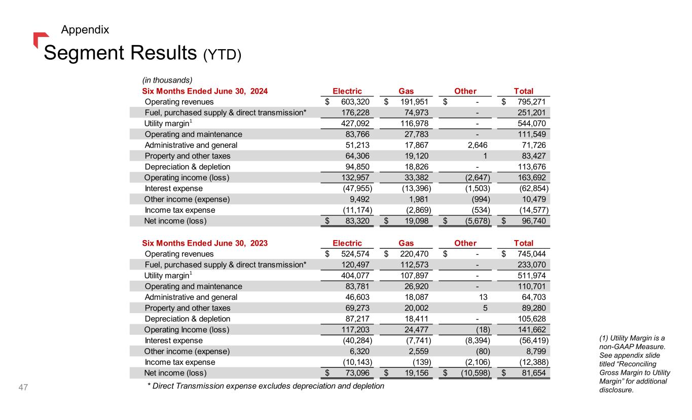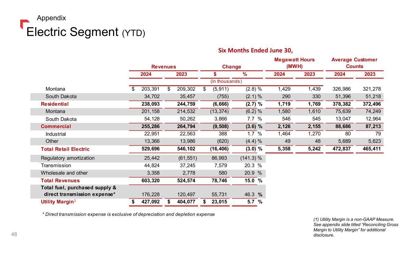Segment Results (YTD) (1) Utility Margin is a non-GAAP Measure. See appendix slide titled “Reconciling Gross Margin to Utility Margin” for additional disclosure. 47 Appendix Six Months Ended June 30, 2024 Electric Gas Other Total Operating revenues 603,320$ 191,951$ -$ 795,271$ Fuel, purchased supply & direct transmission* 176,228 74,973 - 251,201 Utility margin 427,092 116,978 - 544,070 Operating and maintenance 83,766 27,783 - 111,549 Administrative and general 51,213 17,867 2,646 71,726 Property and other taxes 64,306 19,120 1 83,427 Depreciation & depletion 94,850 18,826 - 113,676 Operating income (loss) 132,957 33,382 (2,647) 163,692 Interest expense (47,955) (13,396) (1,503) (62,854) Other income (expense) 9,492 1,981 (994) 10,479 Income tax expense (11,174) (2,869) (534) (14,577) Net income (loss) 83,320$ 19,098$ (5,678)$ 96,740$ Six Months Ended June 30, 2023 Electric Gas Other Total Operating revenues 524,574$ 220,470$ -$ 745,044$ Fuel, purchased supply & direct transmission* 120,497 112,573 - 233,070 Utility margin 404,077 107,897 - 511,974 Operating and maintenance 83,781 26,920 - 110,701 Administrative and general 46,603 18,087 13 64,703 Property and other taxes 69,273 20,002 5 89,280 Depreciation & depletion 87,217 18,411 - 105,628 Operating Income (loss) 117,203 24,477 (18) 141,662 Interest expense (40,284) (7,741) (8,394) (56,419) Other income (expense) 6,320 2,559 (80) 8,799 Income tax expense (10,143) (139) (2,106) (12,388) Net income (loss) 73,096$ 19,156$ (10,598)$ 81,654$ * Direct Transmission expense excludes depreciation and depletion (in thousands) 1 1
