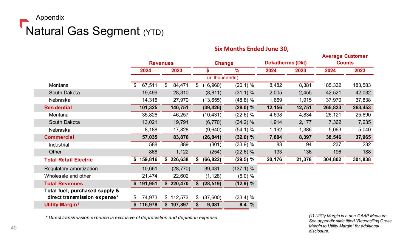 Electric Segment (YTD) (1) Utility Margin is a non-GAAP Measure. See appendix slide titled “Reconciling Gross Margin to Utility Margin” for additional disclosure. 48 Appendix 2024 2023 $ % 2024 2023 2024 2023 Montana 203,391$ 209,302$ (5,911)$ (2.8) % 1,429 1,439 326,986 321,278 South Dakota 34,702 35,457 (755) (2.1) % 290 330 51,396 51,218 Residential 238,093 244,759 (6,666) (2.7) % 1,719 1,769 378,382 372,496 Montana 201,158 214,532 (13,374) (6.2) % 1,580 1,610 75,639 74,249 South Dakota 54,128 50,262 3,866 7.7 % 546 545 13,047 12,964 Commercial 255,286 264,794 (9,508) (3.6) % 2,126 2,155 88,686 87,213 Industrial 22,951 22,563 388 1.7 % 1,464 1,270 80 79 Other 13,366 13,986 (620) (4.4) % 49 48 5,689 5,623 Total Retail Electric 529,696 546,102 (16,406) (3.0) % 5,358 5,242 472,837 465,411 Regulatory amortization 25,442 (61,551) 86,993 (141.3) % Transmission 44,824 37,245 7,579 20.3 % Wholesale and other 3,358 2,778 580 20.9 % Total Revenues 603,320 524,574 78,746 15.0 % Total fuel, purchased supply & direct transmission expense* 176,228 120,497 55,731 46.3 % Utility Margin 427,092$ 404,077$ 23,015$ 5.7 % * Direct transmission expense is exclusive of depreciation and depletion expense Megawatt Hours (MWH) Average Customer Counts Six Months Ended June 30, (in thousands) Revenues Change 1