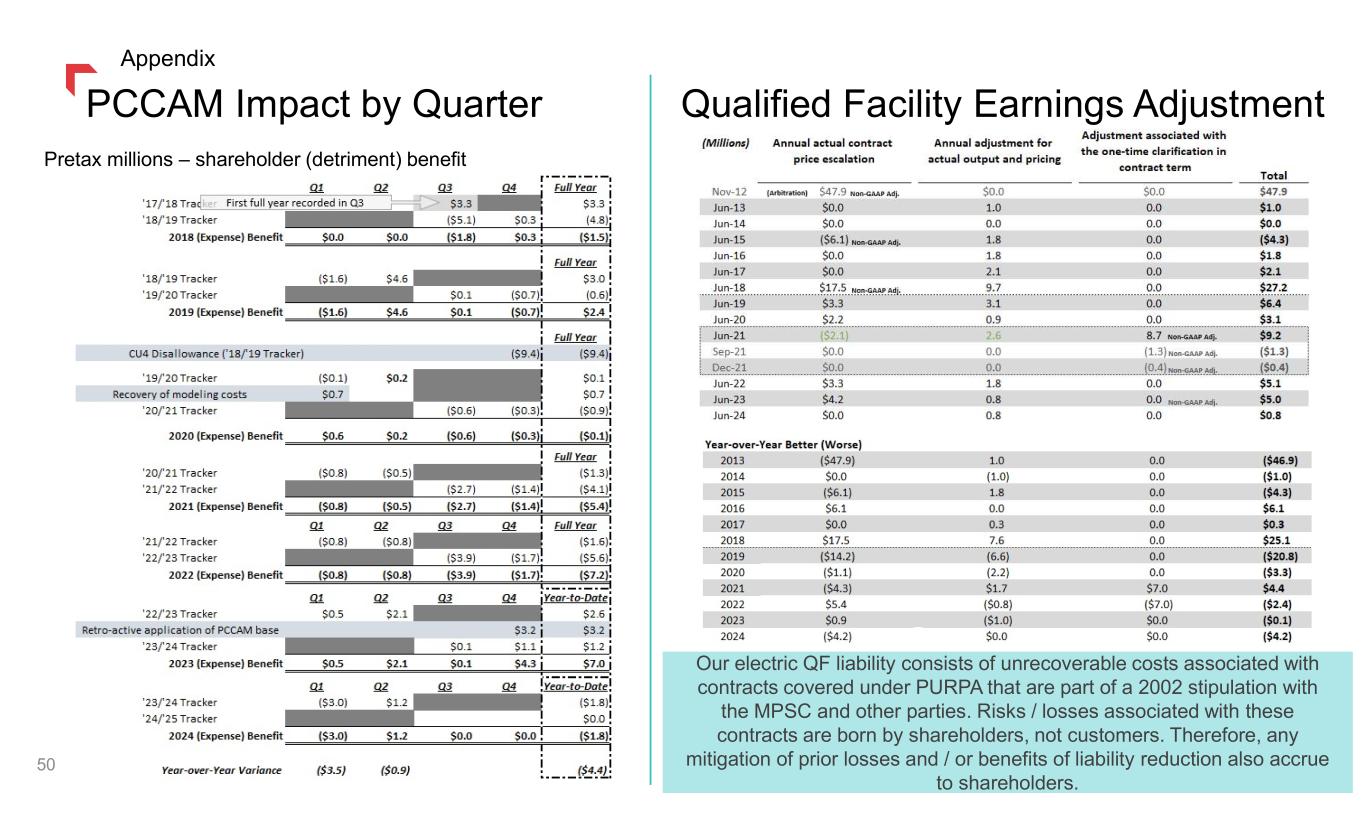 PCCAM Impact by Quarter Qualified Facility Earnings Adjustment Our electric QF liability consists of unrecoverable costs associated with contracts covered under PURPA that are part of a 2002 stipulation with the MPSC and other parties. Risks / losses associated with these contracts are born by shareholders, not customers. Therefore, any mitigation of prior losses and / or benefits of liability reduction also accrue to shareholders. 50 Appendix Pretax millions – shareholder (detriment) benefit