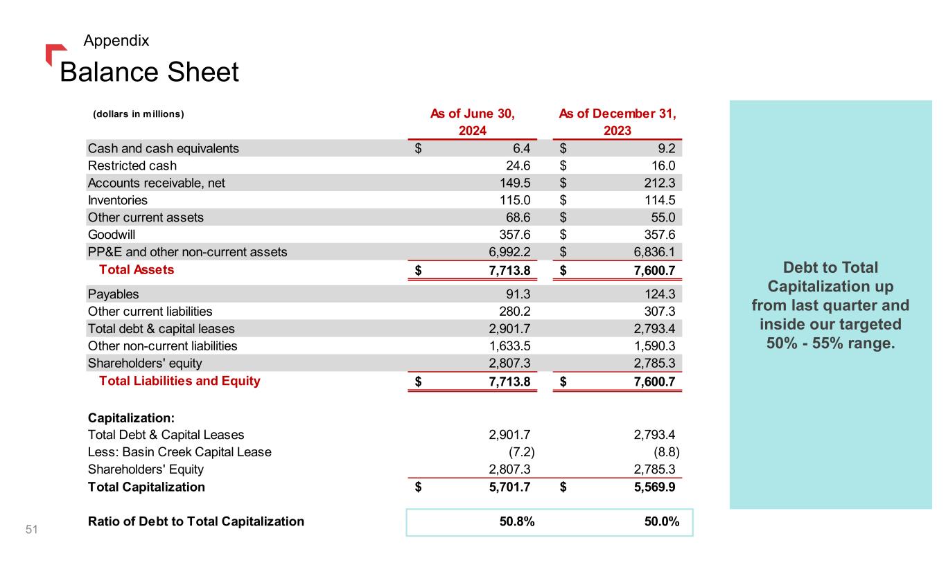 (dollars in millions) As of June 30, As of December 31, 2024 2023 Cash and cash equivalents 6.4$ 9.2$ Restricted cash 24.6 16.0$ Accounts receivable, net 149.5 212.3$ Inventories 115.0 114.5$ Other current assets 68.6 55.0$ Goodwill 357.6 357.6$ PP&E and other non-current assets 6,992.2 6,836.1$ Total Assets 7,713.8$ 7,600.7$ Payables 91.3 124.3 Other current liabilities 280.2 307.3 Total debt & capital leases 2,901.7 2,793.4 Other non-current liabilities 1,633.5 1,590.3 Shareholders' equity 2,807.3 2,785.3 Total Liabilities and Equity 7,713.8$ 7,600.7$ Capitalization: Total Debt & Capital Leases 2,901.7 2,793.4 Less: Basin Creek Capital Lease (7.2) (8.8) Shareholders' Equity 2,807.3 2,785.3 Total Capitalization 5,701.7$ 5,569.9$ Ratio of Debt to Total Capitalization 50.8% 50.0% Balance Sheet 51 Appendix Debt to Total Capitalization up from last quarter and inside our targeted 50% - 55% range.