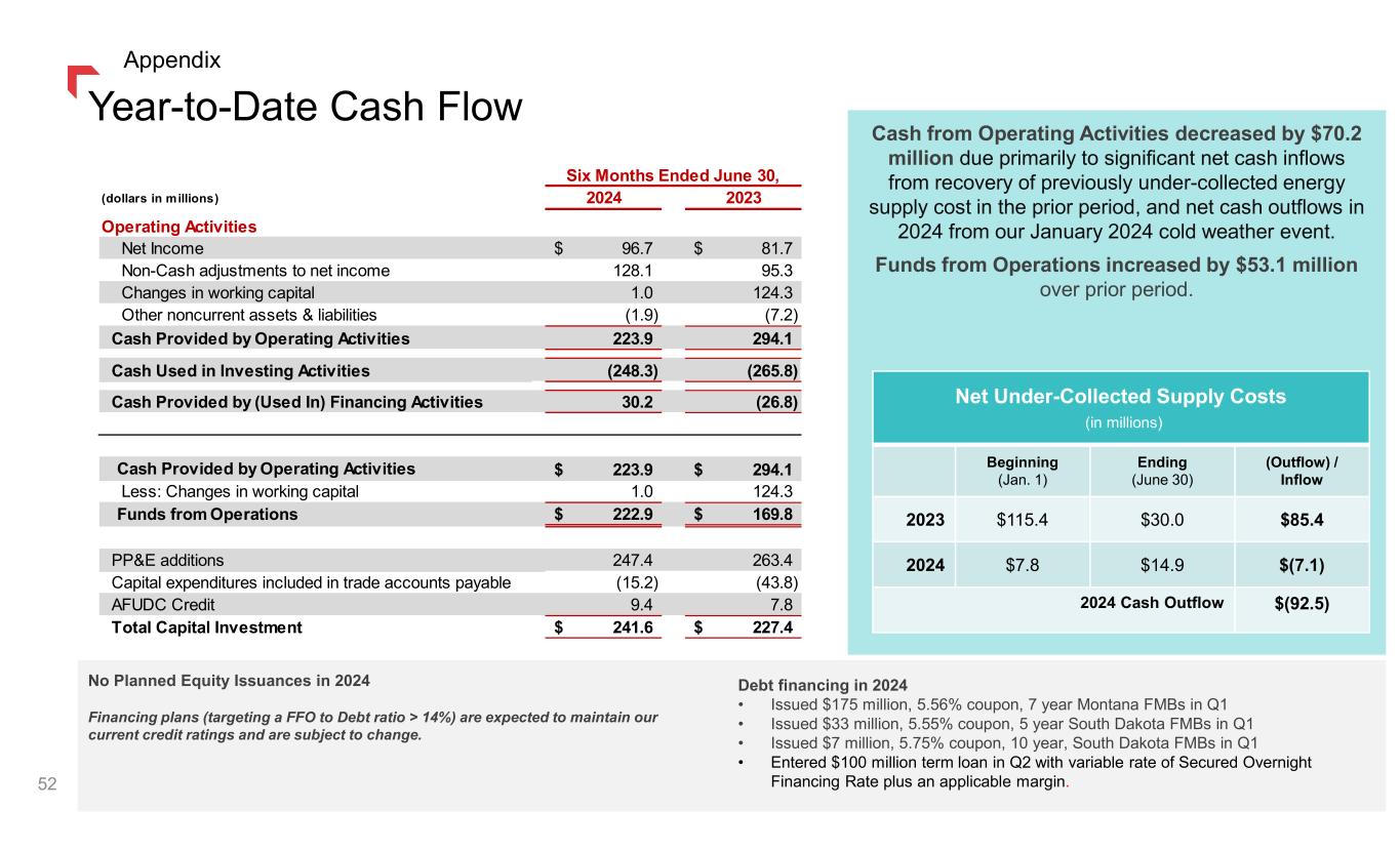 Cash from Operating Activities decreased by $70.2 million due primarily to significant net cash inflows from recovery of previously under-collected energy supply cost in the prior period, and net cash outflows in 2024 from our January 2024 cold weather event. Funds from Operations increased by $53.1 million over prior period. Net Under-Collected Supply Costs (in millions) Beginning (Jan. 1) Ending (June 30) (Outflow) / Inflow 2023 $115.4 $30.0 $85.4 2024 $7.8 $14.9 $(7.1) 2024 Cash Outflow $(92.5) Year-to-Date Cash Flow 52 No Planned Equity Issuances in 2024 Financing plans (targeting a FFO to Debt ratio > 14%) are expected to maintain our current credit ratings and are subject to change. Debt financing in 2024 • Issued $175 million, 5.56% coupon, 7 year Montana FMBs in Q1 • Issued $33 million, 5.55% coupon, 5 year South Dakota FMBs in Q1 • Issued $7 million, 5.75% coupon, 10 year, South Dakota FMBs in Q1 • Entered $100 million term loan in Q2 with variable rate of Secured Overnight Financing Rate plus an applicable margin. (dollars in millions) 2024 2023 Operating Activities Net Income 96.7$ 81.7$ Non-Cash adjustments to net income 128.1 95.3 Changes in working capital 1.0 124.3 Other noncurrent assets & liabilities (1.9) (7.2) Cash Provided by Operating Activities 223.9 294.1 Cash Used in Investing Activities (248.3) (265.8) Cash Provided by (Used In) Financing Activities 30.2 (26.8) Cash Provided by Operating Activities 223.9$ 294.1$ Less: Changes in working capital 1.0 124.3 Funds from Operations 222.9$ 169.8$ PP&E additions 247.4 263.4 Capital expenditures included in trade accounts payable (15.2) (43.8) AFUDC Credit 9.4 7.8 Total Capital Investment 241.6$ 227.4$ Six Months Ended June 30, Appendix